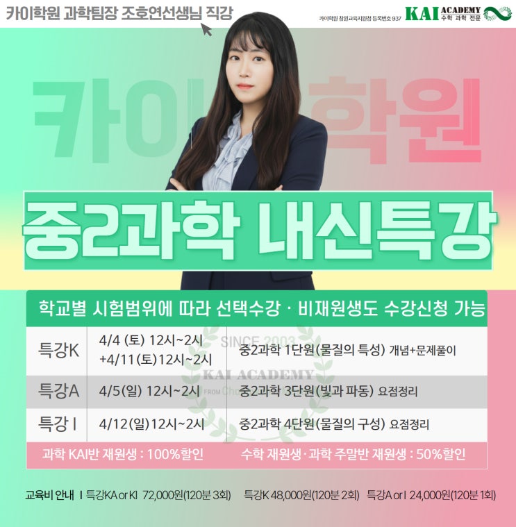 중간고사 직전, 과학 성적 상승을 위한 단기특강을 진행합니다. 압축적인 커리큘럼으로 실전 감각을 끌어올릴 예정입니다. 한정된 인원으로 진행되어, 전화 주시는 순서대로 선착순 마감되오니 반드시 [전화]로 신청 부탁드립니다. 과학 KAI반 재원생은 100%할인 적용됩니다. <img src="https://blogthumb.pstatic.net/MjAyNjAzMThfODEg/MDAxNzczODI3NzcyMjgx.X46W8PLGRpKGgyu2fiBsYXAobTybTjBoov2XXPVu4-og._Wau2zEQLhblYLpyxEp3zNNgnR33nIaeESjqN6zZQ2Yg.JPEG/%C1%DF2%B0%FA%C7%D0_%B3%BB%BD%C5%C6%AF%B0%AD%28%BC%F6%C1%A4%29.jpg?type=s3" />