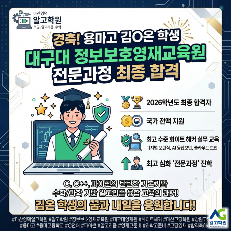 [경축] 용마고 김O온 학생, 대구대학교 정보보호영재교육원 전문과정 최종 합격! - 마산양덕 알고학원