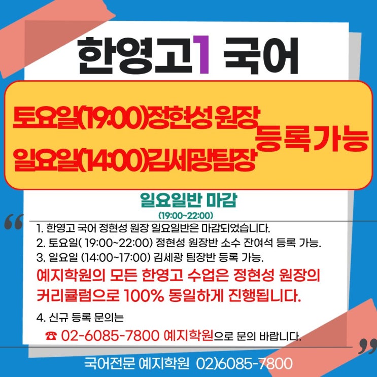 [한영고1 국어] '★정현성 원장 직강 토요일반(19:00~22:00)','★김세광팀장 일요일반(14:00~17:00)' 등록 가능 안내