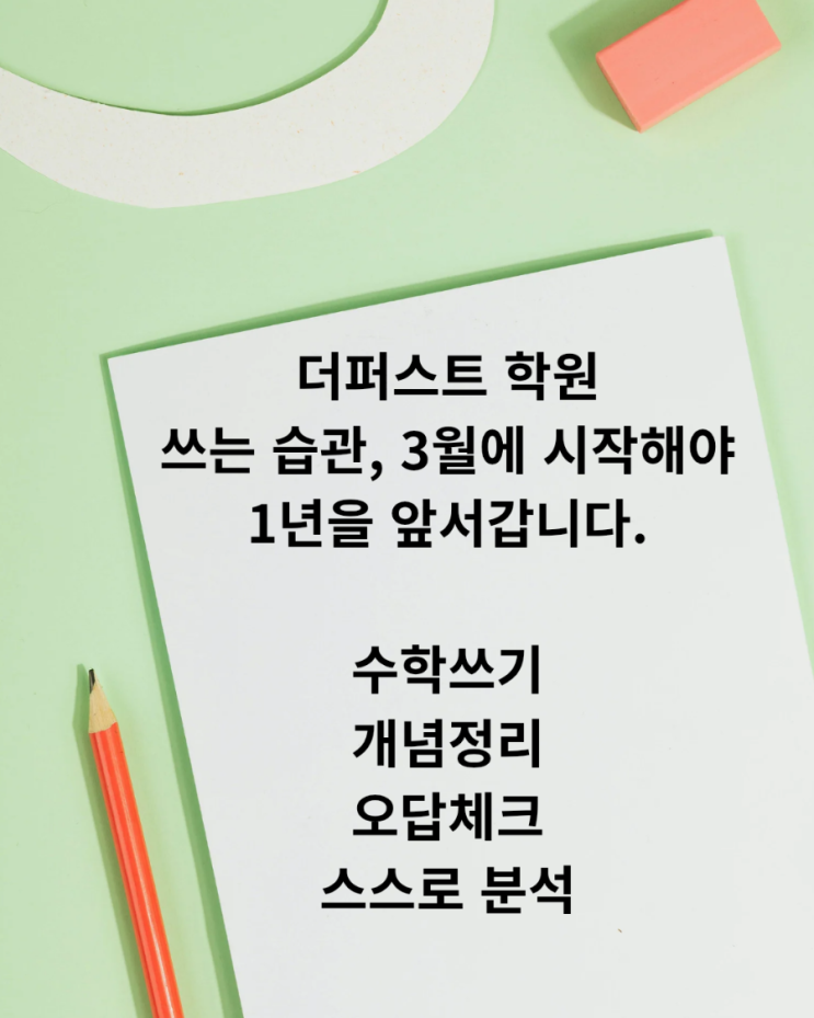 안녕하세요. 향남수학영어학원 더퍼스트학원입니다. 새 학기가 시작되는 3월은 학생들에게 매우 중요한 시기입니다. 새로운 학년, 새로운 교과 내용, 새로운 목표가 시작되는 만큼 이 시기에 어떤 공부 습관을 만들었는지가 1년의 학습 흐름을 결정하게 됩니다. 더퍼스트학원에서는 특히 3월에 가장 중요하게 생각하는 공부 습관이 있습니다. 바로 ‘쓰는 힘’을 기르는 공부 습관입니다. 공부의 기본은 ‘쓰는 힘’입니다 많은 학생들이 공부를 할 때 문제를 풀거나 내용을 읽는 것에 집중합니다. 하지만 실제로 공부가 잘 되는 학생들은 읽고 푸는 것에서 끝나지 않고 반드시 ‘쓰는 과정’을 거칩니다. 왜냐하면 글로 정리하는 과정에서....... <img src="https://blogthumb.pstatic.net/MjAyNjAzMDhfMTg1/MDAxNzcyOTIzMzQ2MTAx.FVV8r4msbjWhZHWqK01aVzNDHBhC_dA73MrFksqGDwMg.jFnhmeeMlsUFyPTz-_lzPR18wHAfmifOsqhJunJzPAkg.PNG/900%A3%DF%B0%B3%B3%E4%B0%FA_%BF%AC%BB%EA%C0%C7_%B1%D5%C7%FC%C0%BB_%BB%FD%B0%A2%C7%CF%B4%C2_%BC%F6%C7%D0%B0%F8%BA%CE%A3%DF20260308%A3%DF053633%A3%DF0001.png?type=s3" />