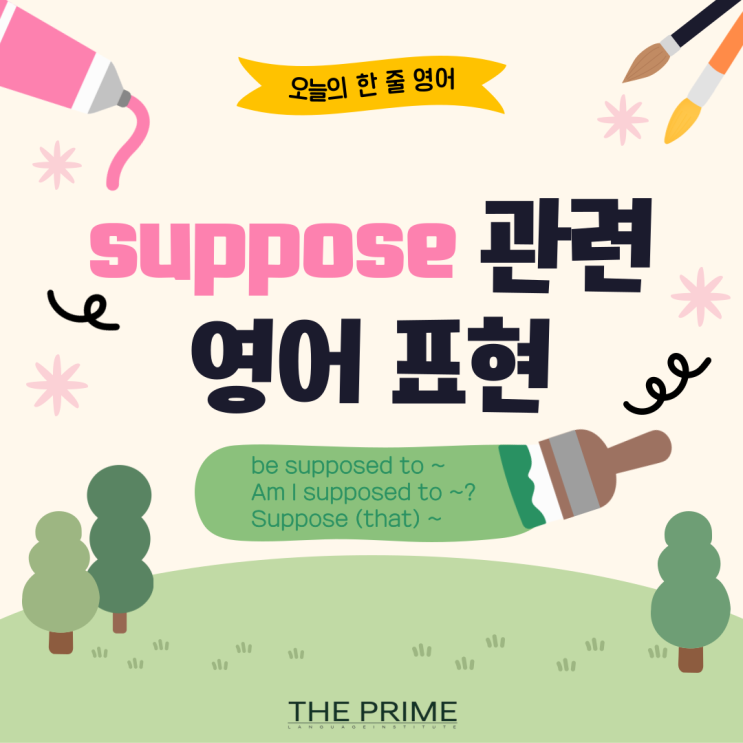 안녕하세요~ 동탄 1:1 영어회화 학원, 더프라임어학원입니다 :) 오늘의 한 줄 영어! suppose를 넣어 활용할 수 있는 영어 표현 3가지를 알차게 준비해봤습니다. ✨ 먼저, suppose는 무엇에 대해 생각하거나 가정하는 걸 말하죠~ 어떻게 회화에서 다양히 활용될 수 있는지 바로 알아볼까요 ?! suppose 관련 오늘의 표현 3가지! be supposed to ~ ~하기로 되어 있다. Am I supposed to ~? 내가 ~해야 되는 거야? Suppose (that) ~ ~라면? 들어보고 많이 본듯한 표현도 있죠^^ 예문과 함께 확실히 익혀보아요! be supposed to~ ~하기로 되어 있다. 원래 그렇게 하기로 약속이 되어 있거나, 계획이 짜여 있는 경우에 사용하는 표현입니다! S....... <img src="https://blogthumb.pstatic.net/MjAyNTEwMjdfMjMx/MDAxNzYxNTYzMjE4Mzc2.X9hFtnoqsePdPyXD7IentnhbpajsTJaSY88PdII_F5Eg.rOWqoyrdK-3FWUs5HudBmEfxfn2bhaBnkfII1Qg4_oEg.PNG/001.png?type=s3" />