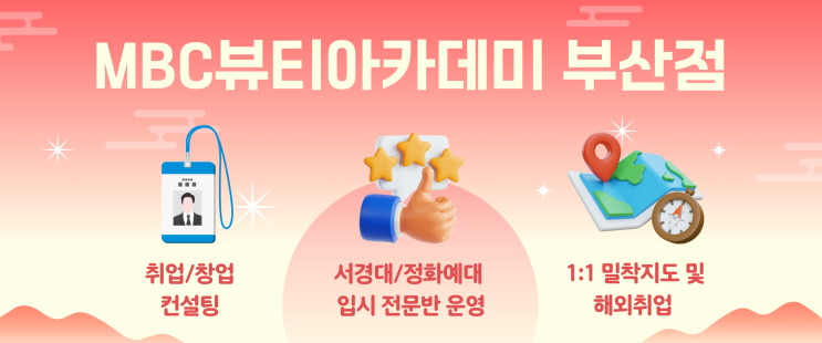 뷰티 진로 고민 중이라면? 부산 MBC뷰티아카데미에서는 취업·창업 컨설팅은 물론, 서경대/정화예대 입시 전문반까지 운영하고 있어요. 또한 1:1 밀착지도를 통해 개인 맞춤형 교육이 가능하고, 해외취업까지 연계되는 체계적인 시스템! 처음 시작하는 분들도 차근차근 실력을 쌓을 수 있는 곳입니다 찾아오시는 길 http://pf.kakao.com/_hxciBxd/chat - 위치: 중앙대로 707 문용빌딩 4층, 5층 - 상담 문의: 051-804-4777 - Instagram: https://www.instagram.com/mbc_busan/ - 카카오톡 상담 바로가기: http://pf.kakao.com/_hxciBxd/chat <img src="https://blogthumb.pstatic.net/MjAyNjAzMTdfMjM1/MDAxNzczNzI1MjY3ODcz.Gy9MxZwr4_cUS-uHk-cLmWO4_kqcxhGJrf8Nr1-_XvUg.cymOsymBSI_LW02GBdpp3zo_pSavffgej-R3pzYoKuog.PNG/%C0%CE%BD%BA%C5%B8_%B0%ED%C1%A4%B0%D4%BD%C3%B9%B0_%BD%E6%B3%D7%C0%CF.png?type=s3" />