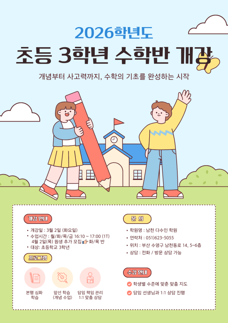 [부산 남천 다수인 수학학원]초등 3학년 수학반 개강 안내