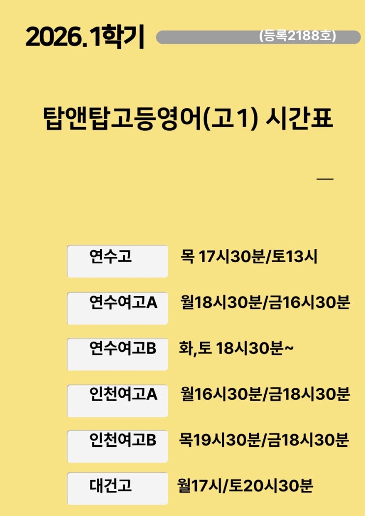 2026년엔 재원 중이던 예비 고1 학생들 중에 옥련여고 배정을 받은 학생이 한 명도 없었습니다. 기존 학생들을 중심으로 우선 편성을 하기에 2026년은 옥련여고반은 없을 예정입니다. 대신 연수여고와 인천여고가 두 개반이 진행됩니다. 연수고는 고3이 끝나는 2학기에 추가반 진행해 드리겠습니다. 연수고,대건고,연수여고,인천여고 시간표 참고해 문의 주세요. 늘 새로운 시작~설레임과 긴장감을 가지고 새 학기 시작해 봅니다. 겨울방학 동안 두 달의 특강 과정을 통해 잘 준비해 둔만큼 좋은 결과로 이어지도록 제대로 달려 보겠습니다.믿고 맡겨 주셔서 감사합니다. (등록 제2188호) 내게 주신 작은 힘 나눠 주며 서는 삶 행복 <img src="https://blogthumb.pstatic.net/MjAyNjAzMDRfMjU3/MDAxNzcyNTU1NTM4NTMw.KgOKU7b36H9aG4NbOJeT1VRn4LqaiVWgRDqtEO_cKP4g.qUCGXmDfH0IfCVWnBxwZAjzZOoPhrk0M2HYMQvUZNO0g.JPEG/%C1%A6%B8%F1%C0%BB%A3%AD%C0%D4%B7%C2%C7%D8%C1%D6%BC%BC%BF%E4%A3%DF%A3%AD003_%A3%A85%A3%A9.jpg?type=s3" />