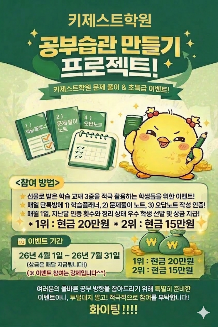 안녕하세요, 루원 영어수학학원 키제스트학원입니다! 새 학기의 시작은 휴식을 취했던 방학을 지나 다시 공부 흐름을 되찾아야할 시기이기도 한데요, 그래서 이번에 키제스트학원은 학생들이 꾸준히 공부하는 힘을 기르고 올바른 공부 습관을 형성할 수 있도록 특별한 이벤트를 준비해보았습니다! 바로 ‘공부습관 만들기 프로젝트’ 입니다!! 이번 프로젝트는 얼마 전 학생들에게 제공된 3가지 학습 노트들을 활용하여 자연스럽게 공부 루틴을 만드는 것을 목표로 하고 있습니다. 학생들이 스스로 계획을 세워보고 매일 학습 과정을 기록하고 공부 내용을 정리하는 경험을 통해 자기만의 공부 방법을 고민해 볼 수 있도록 돕고자 합니다. 왜....... <img src="https://blogthumb.pstatic.net/MjAyNjAzMTVfMTcx/MDAxNzczNTc5MDAyNjA3.OHnycR_YGhczxSVVD6L4oJvfinrsSg3CM9jT4GBZb9og.M7OC7qgUyiNDCUPomIWCMh3GoKUZLdScZghY-uGziF4g.PNG/image.png?type=s3" />
