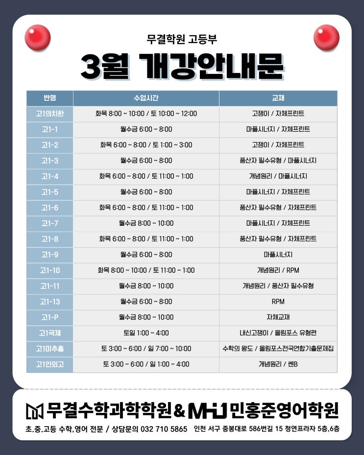 당하중1학년 (월수반)/(화목반)-25만원 당하중2학년(월수반)/(화목반)-25만원 백석중2학년(화목반)-25만원 당하중3학년(월수반)-25만원 백석고1-월수반 -33만원 아라고1-화목반-33만원 백석고2-월수반-33만원 마전고2-월수반33만원 검단고3-월수반-33만원 마전고3-월수반-33만원 시험4주전부터 주말 보강 필수- 자세한 시간표는 문의주세요~^^ 010 3836 8336