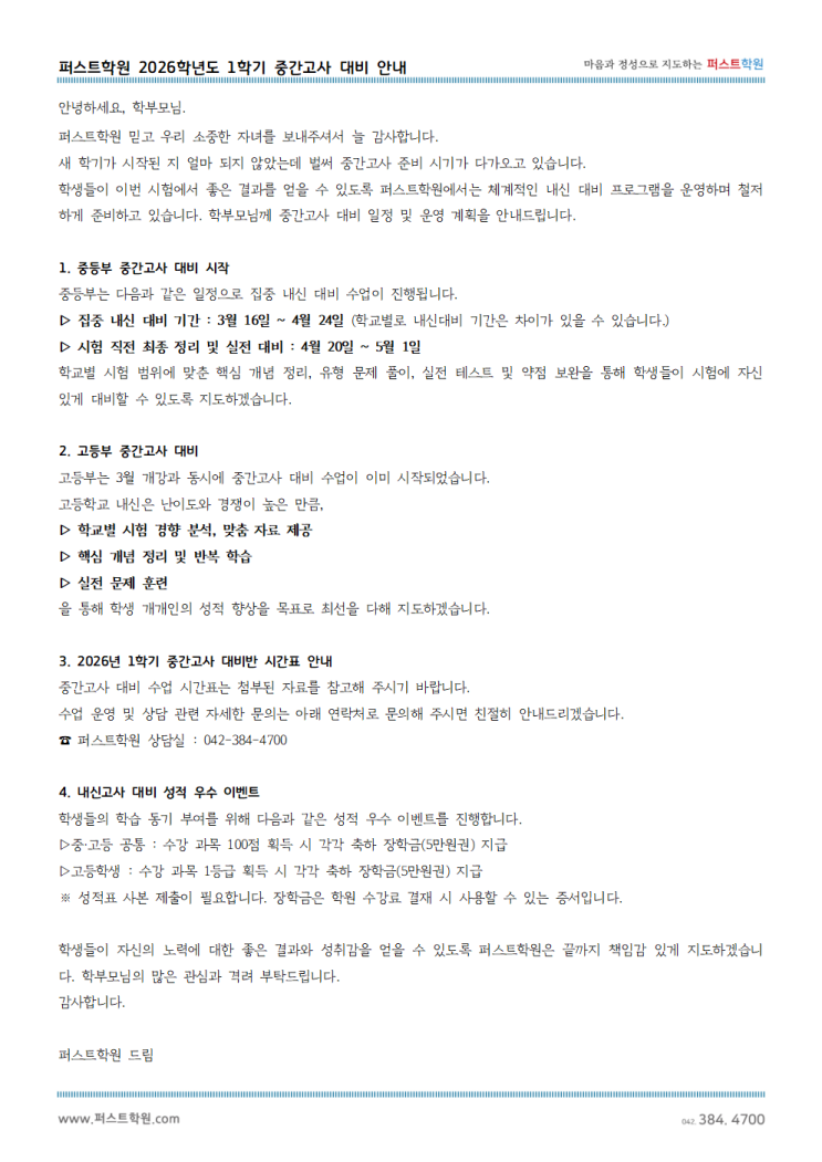 2026학년도 1학기 중간고사 대비 안내 - 대전 둔산동 퍼스트학원