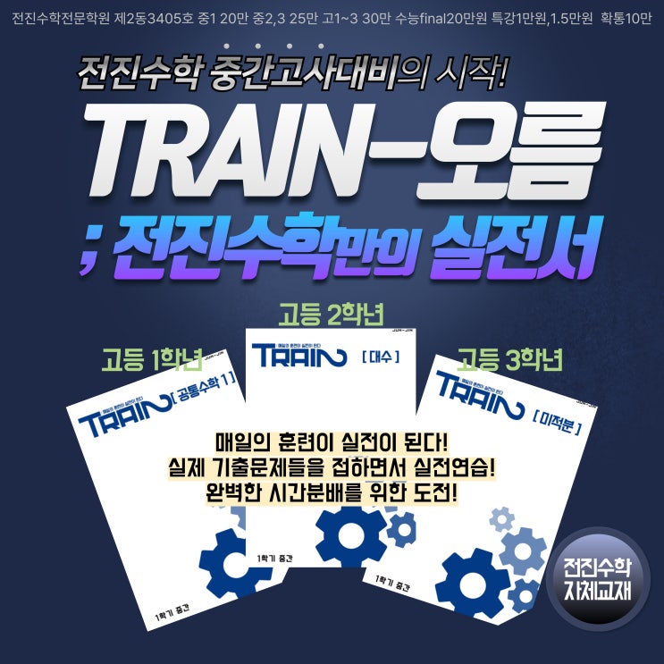 안녕하세요. 전진수학전문학원입니다. 조금씩 풀리고 있는 날씨로 봄이 다가오고 있습니다~ 더불어, 학생들의 1학기 중간고사가 점점 다가오고 있음을 실감합니다. 4월 말 실시되는 2026 1학기 중간고사 대비를 위한 시험대비 기간을 돌입하며 안내드립니다! 전진수학 자체교재 오름 트레인 이번에도! 전진학원만의 전진수학만의 '오름' 과 함께합니다. (전진학원 제작) 오름;전진수학 자체교재 매일의 훈련이 실전이 된다! 실제 기출문제들을 접하면서 실전연습! 완벽한 시간분배를 위한 도전! 전진수학 자체 교재를 제작하고 제공하는데에 그치지 않고, 학생들과 함께한 수업과 연계하여 "학교 시험에 이렇게 나온다!"....... <img src="https://blogthumb.pstatic.net/MjAyNjAzMTdfMjU3/MDAxNzczNzU4MjY2MzA4.fM9EOSQIid4aQecLI1MghaTlL4WRAs5IcAZ0PojBxDwg.gwA_xK9tQaTbuby2mYW6TOA0wquxgRa1jk4dTP9nbCkg.JPEG/%C1%A6%B8%F1%C0%BB-%C0%D4%B7%C2%C7%D8%C1%D6%BC%BC%BF%E4__%BA%B9%BB%E7%BA%BB-001_%281%29.jpg?type=s3" />