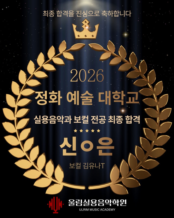 안녕하세요. 은평구 울림실용음악학원입니다. 2026학년도 실용음악과 입시에서 정화예술대학교 실용음악과에 합격한 학생의 기쁜 소식을 전해드립니다. 입시 결과가 발표되는 순간은 항상 설레면서도 긴장되는 시간이지만, 학생이 준비해온 과정을 함께 지켜본 입장에서는 그 노력의 시간이 떠올라 더욱 의미 있게 느껴집니다. 어렸을때부터 음악을 해야 전공을 할 수 있나요? 꼭 그런것은 아닙니다. 물론 어린 시절부터 음악을 접했다면 조금 더 빠르게 결과를 만들어갈 수는 있습니다. 하지만 울림만의 전략적인 입시 준비 시스템과 입시 경력 최소 7년 이상의 전문 강사진이 함께하기 때문에 현재의 출발선이 어디에 있든 학생의 속도에 맞는....... <img src="https://blogthumb.pstatic.net/MjAyNjAzMTdfMTk3/MDAxNzczNzI0Mzg0OTYz.PHHM2fDZD2KgoZ2MLkKRalsC5AbwO_HBsnbFsrsuTzkg.C-0p4aU-tobKcUhkN8D_DTs9Dv0LEdQ2c4MNBXOIHYYg.JPEG/12.jpg?type=s3" />