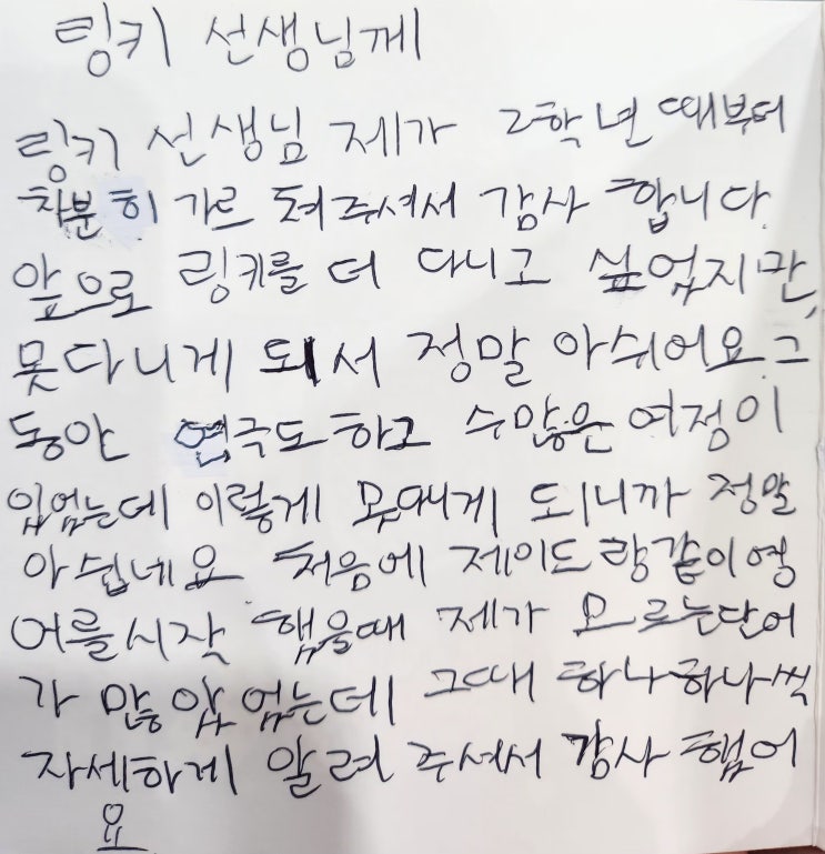 안녕하세요, 링키영어 관악타운 Elsa입니다^^ 2월 말, 23년 개원 이후 첫 졸업식이 있었답니다~ 늦게 만난 친구는 1년, 오래 만난 친구는 3년을 함께 웃으며, 칭찬하며, 응원받으며, 대형 학원에서는 느낄 수 없는 깊은 친밀감을 쌓았었죠~ 더 함께 하고 싶은 마음에 졸업하는 것이 서로 참 아쉽고, 어색합니다.. '잘 내보내야한다' 는 저의 멘토 원장님의 말씀이 이제서야 마음에 와 닿네요. 우리 졸업생들의 타 학원의 레벨 테스트 결과를 들으며 '어디서 공부하셨어요?'라는 말을 들으셨다는 어머님의 말씀이 저에게 너무나 큰 힘이 될 것 같습니다! 한 고마운 졸업생이 준 편지를 쑥쓰럽지만 보여드려요~♡ 모든 졸업생....... <img src="https://blogthumb.pstatic.net/MjAyNjAzMDlfODAg/MDAxNzcyOTg0OTY0ODEw.9qgsSeMD8NUim-b3WDYAgWi3RgTPsnAHtp_Tm3A_lWEg._-7hQzZxLUoCjWj4g7AV5NZ87IL_M-m4asQzMwvkHzMg.JPEG/KakaoTalk_20260308_232232253.jpg?type=s3" />