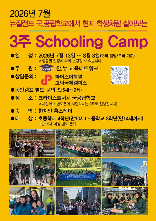 2026년 7월 뉴질랜드 공립학교 스쿨링 캠프 여름방학 동안 뉴질랜드 공립학교에서 현지 학생들과 함께 생활하며 공부할 수 있는 3주 스쿨링 캠프를 소개드립니다. 단순한 영어 수업이 아닌 실제 학교 수업에 참여하며 현지 학생들과 교류하는 프로그램으로, 영어 실력뿐 아니라 글로벌 경험을 쌓을 수 있는 특별한 기회입니다. 현지 학생처럼 경험하는 학교생활 이번 프로그램은 뉴질랜드 공립학교에서 진행되며 참가 학생들은 다음과 같은 경험을 하게 됩니다. 뉴질랜드 공립학교 정규 수업 참여 현지 학생들과 팀 프로젝트 및 활동 학교 스포츠 및 예술 활동 체험 영어로 진행되는 다양한 수업 참여 학생들은 현지 교실 환경에서 자연스럽게 영....... <img src="https://blogthumb.pstatic.net/MjAyNjAzMTJfMTY3/MDAxNzczMzA0OTg0MzAw.ERpUysYU3O7i9xRjTPhuCj0Pt31Pc7Q85xIIVgcPjB4g.1n-PkV6GoAsOeVjquBINC93TmkVYytTtE79_AA_Xv8gg.JPEG/%C1%A6%B8%F1%C0%BB_%C0%D4%B7%C2%C7%CF%BC%BC%BF%E4_%288%29.jpg?type=s3" />