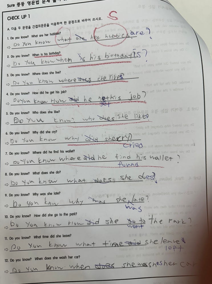 간접의문문은 외워야 할 것들이 좀 있어 아이들이 어려워하는 문법중의 하나입니다. 오늘은 일단 1단계! 의문사가 없는 문장의 간접의문문 만들기! 먼저 개념설명을 해야겠죠? 처음부터 끝까지 프린트물에 있는 문장을 간접의문문으로 함께 만들어 봅니다. 그리고 이제 실전! 1차 간접의문문 만들기 흠... 역시 좀 어려웠나봅니다. 틀린 부분을 함께 고쳐보고 다시 혼자서 간접의문문을 만들어 봅니다. 2차 도전! 틀린 부분이 많이 줄었네요. 그래도 안심할 수 없죠. 한번 더! 3차 도전! 이제 안까먹겠쥬? 까먹어도 괜찮단다! 토 나올때까지 반복하게 해줄께 흐흐흐흐 <img src="https://blogthumb.pstatic.net/MjAyNjAzMDZfMjUx/MDAxNzcyNzk0NTExNzE4.qKq975zAH0HQ8gWjoseigD4O8cmtI2D4C4BnEeDMjoog.tCZWSX4monxhuhvDyLJc5lMJv8guTh7D7jQBfij8mgAg.JPEG/KakaoTalk_20260306_194817025.jpg?type=s3" />