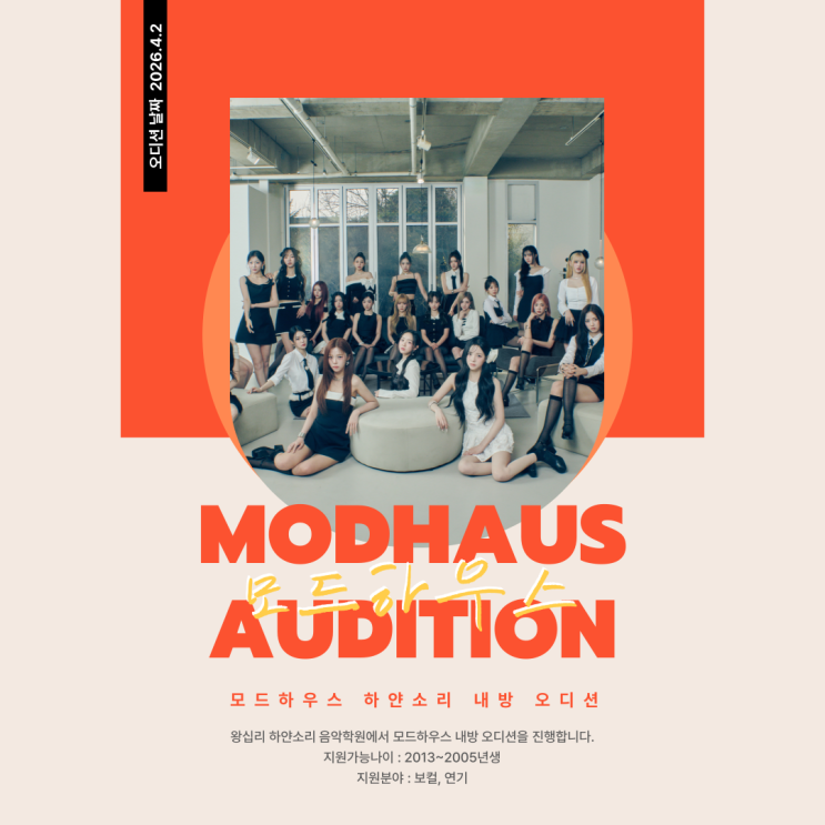트리플에스, 아르테미스, 아이덴티티가 소속된 회사 모드하우스에서 2026년 4월 2일 18시 하얀소리에 내방 오디션을 진행합니다. 일시 : 2026년 4월 2일 목 PM 6:00 지원 성별 : 남, 여 지원 연령 : 2013~2005년생 까지 지원 분야 : 노래 or 랩(무반주) / 댄스(음원 개별 준비) / 자유 연기 - 1분 내외 *춤과 노래(랩) 연기 중복 지원 가능. <img src="https://blogthumb.pstatic.net/MjAyNjAzMDdfMjUg/MDAxNzcyODU2NzI4Mzc1.zCCKo3yukiPxg7GINEfZSltMYqlnMoJe7zV1Fo5cquAg.U2RrEw19ef_IQsMVoerqOYi758e5L9G5TDARn1m4I7kg.PNG/001.png?type=s3" />