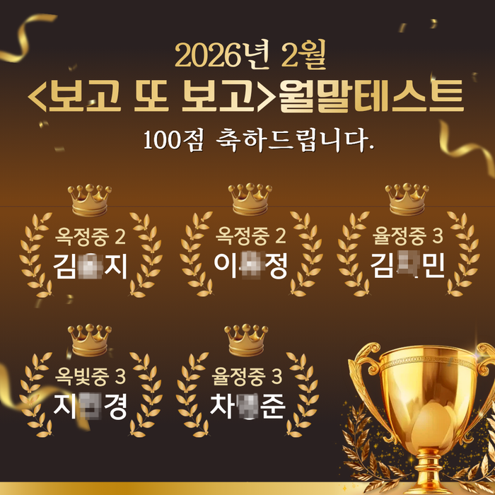 2월 월말 테스트 결과 발표 100점 5명!!! 정말 자랑스럽습니다. 단어 공부는 "열심히 한 것 같아"로 끝나면 금방 잊어버립니다. 그래서 우리는 매일, 매주, 매달 반복적으로 단어를 확인합니다. 아이들의 노력을 점수로 확인하고 그 성취를 칭찬과 보상으로 꼭 남겨주고 있어요. 3월엔 더 바빠져요. 그래서 더 다정하게 말해주고 싶어요. 3월 새 학기 시작이라 학교도 정신없고, 적응하느라 마음도 바빠지고 아이들이 예민해질 수도 있는 시기예요. 그래서 3월에 단어 공부가 잠깐 느슨해지는 경우가 종종 생깁니다. 다들 잘 아시겠지만, 이럴 때일수록 조금씩이라도 꾸준히가 중요해요. 3월 아이들의 루틴이 무너 지지 않게 옆에서 확....... <img src="https://blogthumb.pstatic.net/MjAyNjAzMDVfMjQ2/MDAxNzcyNjg5OTk4ODI3.w0-I0NFDtmBSkqz44kFPnFSg9BosGynRu7Y5ATOMbCQg.yGiDX3lPOPF2tQnpojqFQLUWjhJ_QZg3EsH6HoMDHZMg.PNG/3.png?type=s3" />