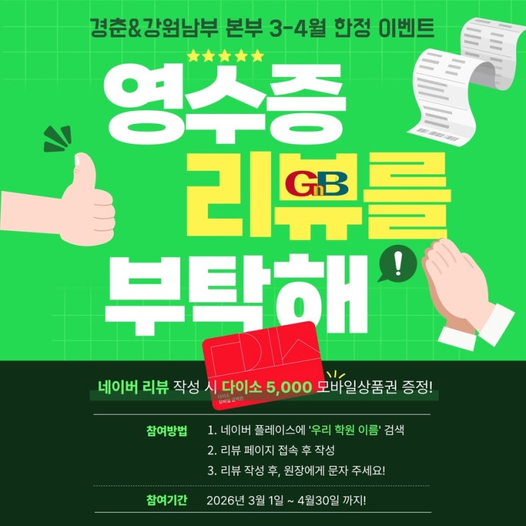 안녕하세요 춘천 GnB어학원 퇴계숲 캠퍼스 & 춘천 캠퍼스입니다. 3월, 4월 한정으로 네이버 영수증 리뷰 이벤트를 진행합니다! 학부모님들의 소중한 리뷰는 학원을 선택하시는 분들께 큰 도움이 되고, 저희에게도 큰 힘이 됩니다 참여 방법 안내 1️⃣ 네이버 플레이스에서 ‘GnB어학원 퇴계숲캠퍼스’ 또는 ‘GnB어학원 춘천캠퍼스’ 검색 2️⃣ 리뷰 쓰기 클릭 3️⃣ ‘영수증 인증’ 선택 후 캡쳐한 영수증 등록 4️⃣ 리뷰 작성 완료 5️⃣ 작성 완료 화면을 원장에게 문자로 보내주세요 확인 후 ★다이소 5,000원 모바일상품권★을 보내드립니다 참여 기간은 2026년 3월 1일 ~ 4월 30일까지입니다. 많은 관심과 참....... <img src="https://blogthumb.pstatic.net/MjAyNjAzMDNfMTcy/MDAxNzcyNTM0MTIzODMw.aN7NS4BlFATmSjmBwMF3VZmL7wcHauJU74kVYh0D8OQg.NXXWiPkVK3YFxaxT7HhtLf6Poc1K0zPEN0j-_VLYqOkg.JPEG/IMG%A3%DF1274.JPG?type=s3" />