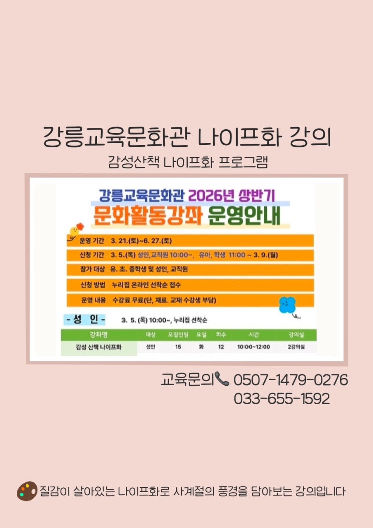강릉에서 그림을 좋아하는 성인들을 위한 특별한 미술 수업이 시작됩니다. 강릉교육문화관에서 진행되는 ‘감성산책 나이프화’ 강의는 나이프를 사용해 질감과 색의 매력을 표현하는 아크릴 회화 수업입니다. 나이프화는 두껍게 올려지는 물감의 질감과 자유로운 터치가 특징인 표현 기법으로, 그림을 처음 접하는 분들도 부담 없이 접근할 수 있으면서 동시에 깊이 있는 작품 표현이 가능한 매력적인 장르입니다. 이번 강의에서는 단순히 그림을 완성하는 것을 넘어 색의 이해, 질감 표현, 풍경 표현 기법을 단계적으로 익히며 한 작품 한 작품 완성도를 높여가는 과정으로 구성되어 있습니다. 이번 강의는 총 12회 과정으로 진행되며, 기초 표....... <img src="https://blogthumb.pstatic.net/MjAyNjAzMDlfMjE4/MDAxNzczMDIyNDAxODk1.TvwKH99mekXwaTz3AP6fnsjNKPrlAdHAVMdy_Mm4CYEg._GlB3Arju_2niTZTJtqeh78ymOH2fZ5DcWK7wY8haFgg.JPEG/IMG%A3%DF3708.JPG?type=s3" />