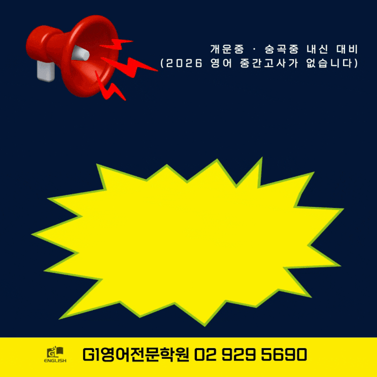 성북구 개운중 · 숭곡중 내신 대비 -G1영어 (2026 영어 중간고사가 없습니다) 이번에 개운중도 숭곡중처럼 중간고사를 보지 않고 수행평가로 대체하고 기말고사만 진행한다고 합니다 왜 이런 결정을 했는지는 정확히 알 수 없지만, 기말고사 한 번에 시험을 보는 구조가 되면 시험 범위가 많아져 학생들이 부담을 느낄 수도 있을 것 같습니다 중학교 공부는 단순히 시험 대비만을 위해 하는 것이 아니기 때문에 시험 방식이 어떻게 바뀌더라도 결국 중요한 것은 학생들이 평소에 성실하게 준비하는 것이라고 생각합니다 성북구 영어학원 G1은 단순히 내신 대비만을 위해 다니는 학원이 아닙니다 시험기간에는 내신 대비를 진행하지만 평소에는 어....... <img src="https://blogthumb.pstatic.net/MjAyNjAzMTVfMTk4/MDAxNzczNTY1NTc3ODQx.Lk-bIZ4ZsVCLSnujkI1WQW4mj5mTbNUXwdbiAlB-S4Ug.31PSsofiQxku9bdbBEegPi-_Luebgn0MNsrHmHkFpQEg.GIF/g1%BF%B5%BE%EE2.gif?type=s3" />