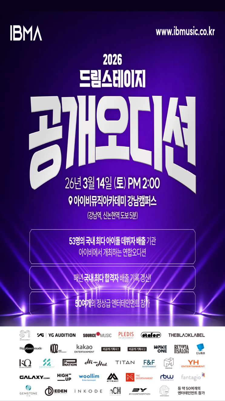 26년 3월 14일 토요일 오후 2시에 아이비학원 강남N캠퍼스에서 진행하는 50개 기획사, 연합 공개오디션에 아이비학원 오디션반 학생들이 참여해서 멋진 모습을 보여주고 왔습니다!!! 설레는 마음으로 리무진버스를 학원앞에서 타고 서울 강남까지 한번에 다녀오는 오디션입니다. ^^ 인원이 많다보니 이 방법이 제일 안전하고 편합니다! 3시간 가량 버스로 이동 후 아이비학원 강남N캠퍼스에 도착해서 참가 확인과 번호표를 받고 순서표를 옷 위에 부착 후 순서를 기다립니다. 본인 순서를 모두 확인하고 번호순대로 의자에 앉아서 차례를 기다립니다. 5명씩 1조로 진행되며 대기 의자에 앉아 주의사항을 전달 받은 후 오디션이 진행되는 홀로 들....... <img src="https://blogthumb.pstatic.net/MjAyNjAzMTVfOTUg/MDAxNzczNTU3ODkzMDA0.nHbF3EMiEY2W7O3vna-gJdb5GrGtuhaS2stPpapRk3cg.3IQf4rDPuKng3zrnmrBoHydYTL4IGxhTMhQEh24oEEQg.PNG/%C0%CD%BB%EA%BF%C0%B5%F0%BC%C7%C7%D0%BF%F8_%B5%E5%B8%B2%BD%BA%C5%D7%C0%CC%C1%F6_%BF%AC%C7%D5%BF%C0%B5%F0%BC%C7.png?type=s3" />