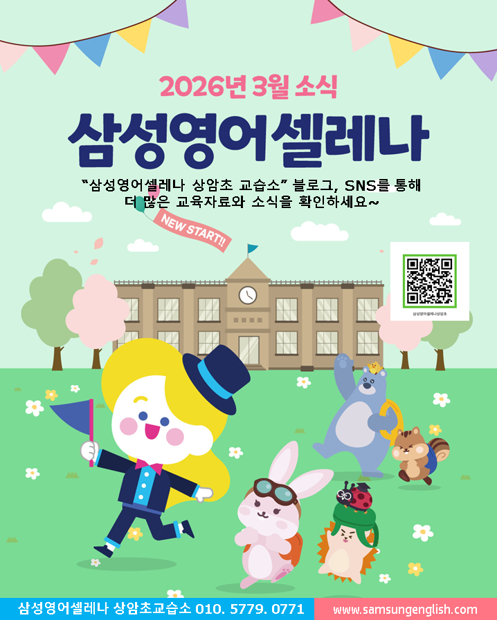 안녕하세요? 상암동 영어학원 삼성영어셀레나 3월 소식지 보내드립니다. 어느덧 추위가 가고, 따뜻한 햇살과 함께 3월이 찾아왔습니다. 새 학년, 새 학기를 맞이해 아이들도 설렘과 긴장 속에서 새로운 출발선에 서 있겠지요. 교실마다 다시 웃음소리가 채워지고, 아이들의 발걸음도 한층 더 힘차게 느껴지는 요즘입니다. 3월은 시작의 달인 만큼 기대와 함께 작은 걱정도 있으실 거라 생각합니다. 하지만 아이들은 생각보다 더 씩씩하고, 또 하루하루 놀라울 만큼 성장합니다. 저희 상암동 영어학원 삼성영어셀레나에서도 아이들이 새로운 환경에 잘 적응하고, 즐겁게 영어와 친해질 수 있도록 따뜻하게 응원하고 세심하게 지도하겠습니다. 새 학....... <img src="https://blogthumb.pstatic.net/MjAyNjAzMDJfMTQx/MDAxNzcyNDIyNzQ4NzU2.cFXh2qWGJIvwsEzM2h0_szXXCq-7SEbQDFdxFQO6Hv8g.oq96i6fsTQvcnCAn70rHzYz3Bi_OtYLJgLo-RHkTrikg.PNG/%BD%BD%B6%F3%C0%CC%B5%E51.PNG?type=s3" />