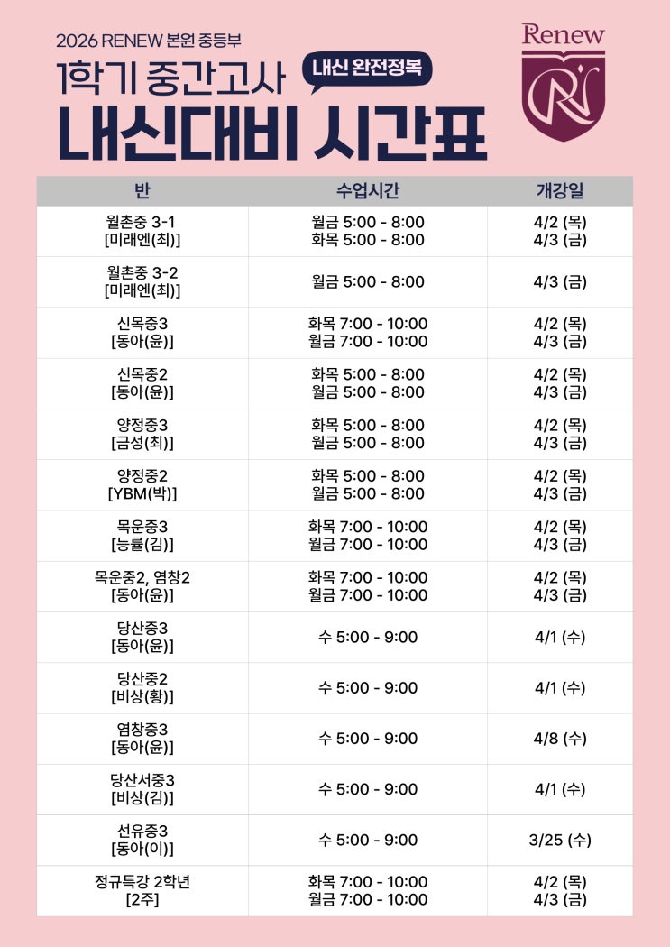 [리뉴어학원 본원 중등] 중등부 내신 시간표 1학기 중간고사
