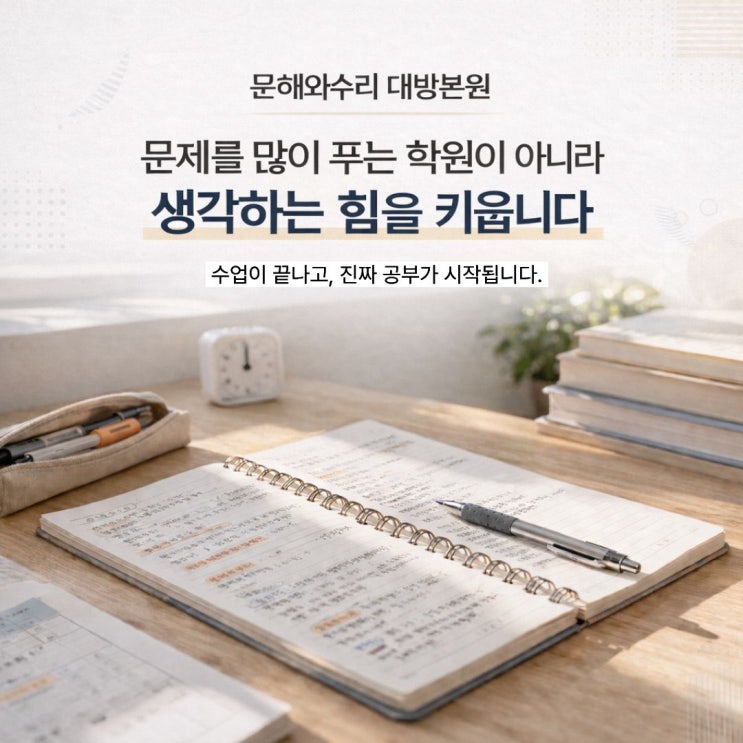 안녕하세요. 바른 이해의 시작, 문해와수리 대방본원입니다. 저희 학원에서는 수업이 끝났다고 해서 공부가 끝나지 않습니다. 오히려, 그날 배운 내용을 ‘내 것으로 만드는 시간’이 가장 중요하다고 생각합니다. 그래서 매 수업이 끝나면 아이들은 짧지만 꼭 이 시간을 가집니다. ✔ 오늘 배운 내용 정리 ✔ 내가 잘한 부분 ✔ 어려웠던 문제 ✔ 실수한 이유 ✔ 다음에 어떻게 해야 할지 이 모든 과정을 아이 스스로 직접 적어보는 시간입니다. 처음에는 대부분의 아이들이 “그냥 문제 풀었어요…” “잘 모르겠어요…” 라고 말합니다. 하지만 이 과정을 반복하면서 아이들의 변화는 눈에 띄게 달라집니다. ✔ 문제를 틀리면 그냥 넘어가지 않....... <img src="https://blogthumb.pstatic.net/MjAyNjAzMjRfNzYg/MDAxNzc0MzUxMDY3NTE5.a1Zc9Ncb9wYYcQ2GHNj_tL_C7v9V6n_oWR0WJCQKFP8g.ksOlYws5TFmpj9dEeCNjH_KgL9ml4q19cn3br9TbBnwg.JPEG/12.jpg?type=s3" />