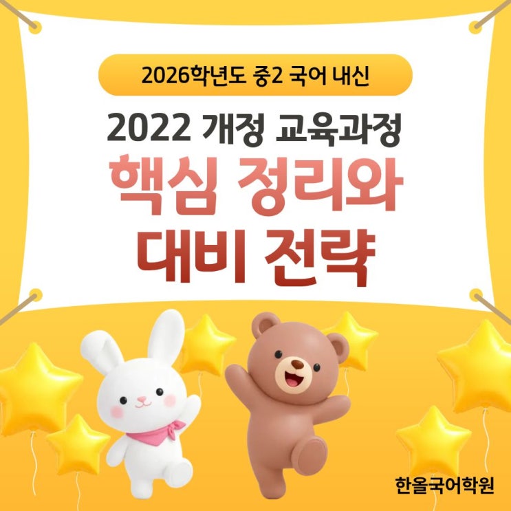 안녕하세요? 한올국어학원 한올쌤입니다. 2026학년도부터 중학교 2학년 학생들에게 '2022 개정 교육과정'이 전면 적용됩니다. 교과서가 바뀌었다는 것은 단순히 내용이 변한 것이 아니라, 평가의 기준과 공부의 방향이 완전히 달라졌음을 의미합니다. 중2가 된 아이들의 첫 시험, 우리 아이의 첫 단추를 어떻게 끼워야 할지 고민이신 학부모님들을 위해, 개정 국어의 핵심 포인트와 필승 내신 전략을 정리해 드립니다. 1. 무엇이 달라졌을까요? (3대 핵심 변화) ① '매체' 영역의 신설 : 텍스트를 넘어 미디어로 기존의 [듣기, 말하기, 읽기, 쓰기, 문법, 문학] 영역에 '매체'가 추가되었습니다. 이제 아이들은 시....... <img src="https://blogthumb.pstatic.net/MjAyNjAzMjNfMTA5/MDAxNzc0Mjc1ODEyOTk2.5VWyawasG9LMrq00icaJmsGFM3o5wWgzIVjGoHQKc2gg._vnlkPNCphAr52qedJFQk2df5J7T0EfPbkogdCuGBIYg.JPEG/%C1%A6%B8%F1%C0%BB_%C0%D4%B7%C2%C7%D8%C1%D6%BC%BC%BF%E4..jpg?type=s3" />
