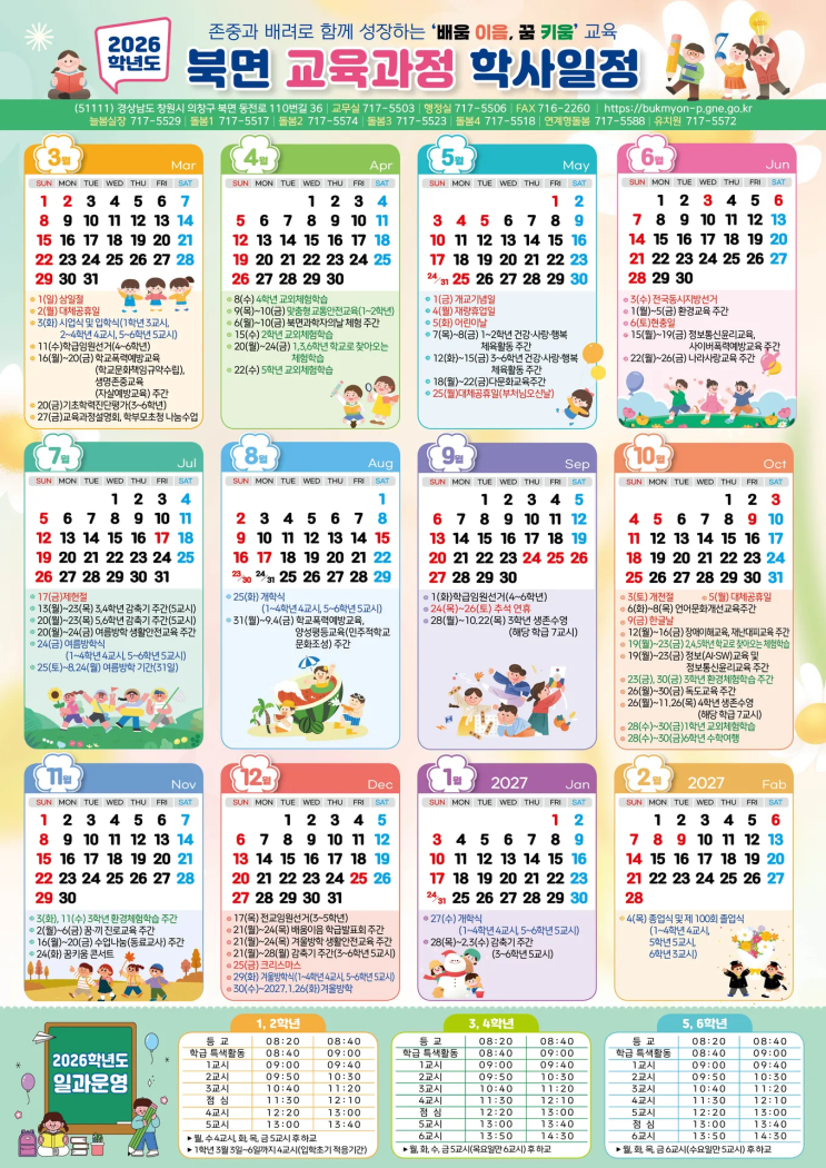 북면초 · 감계초 학사일정 안내 안녕하세요, 영어쑥쑥어학원입니다 북면초등학교와 감계초등학교의 학사일정이 발표되어 안내드립니다. 학부모님들께서는 자녀의 학교 일정 확인하시어 학습 계획에 참고 부탁드립니다. 주요 안내사항 개학 및 방학 일정 재량휴업일 및 학교 행사일 중간·기말 평가 기간 (해당 학년) 학사일정에 따라 학원 수업 일정 및 숙제량이 일부 조정될 수 있으니 참고 부탁드립니다. 특히, 시험 기간 및 행사 일정 전후로는 학습 집중도가 중요하므로 아이들이 꾸준히 학습 리듬을 유지할 수 있도록 가정에서도 함께 도와주시면 감사하겠습니다 저희 영어쑥쑥어학원은 학교 일정과 연계하여 아이....... <img src="https://blogthumb.pstatic.net/MjAyNjAzMjZfMjEy/MDAxNzc0NTA2MjE2ODMz.cDn04sYH24-mZJrn8AFiTyJvv96MexOi_P-QDxw1QMcg.r8OCmwNYQ5e-DsrbTClBCBHeH2y44TcL7cEfsT_MqnAg.PNG/KakaoTalk_20260326_152008579.png?type=s3" />