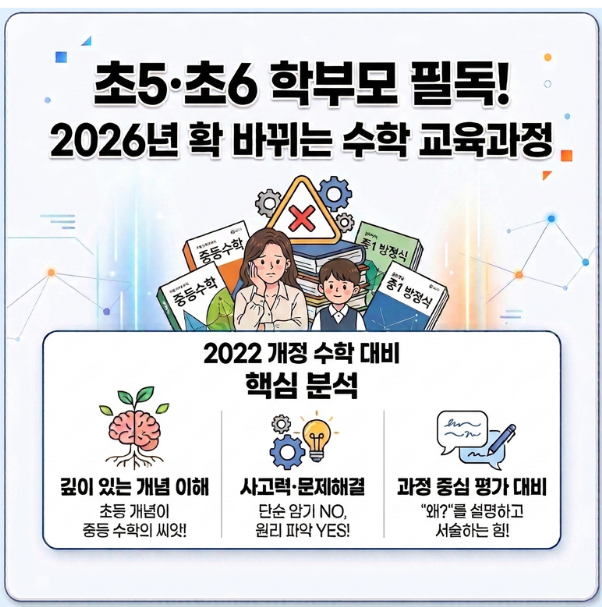 "우리 아이가 지금 중등수학 선행 시키고 있는데 맞는걸까요?" 초등5~6학년 자녀를 둔 학부모님들이라면 한번쯤 이 질문을 품어봤을 겁니다. 2026년 3월 초등학교 수학교과서가 전면 개정되었는데요. 지금 시키는 선행이 과연 도움이 될까요? 오늘은 초등수학 시매쓰에서 2022개정 교육과정이 요구하는 수학에 대해 정리해 볼게요 2026년 수학 교과서, 무엇이 바뀌나 ① 초등과 중등 수학 교육과정의 연계 강화 이번 교육과정의 핵심은 디지털 시대에 맞춰 수학 교과과정을 변화시키고, 초·중등의 교과를 통합하여 학교급 간 연계 과정을 강화하는 것입니다. 쉽게 말하면, 초등 수학과 중등 수학을 따로 보지 말고 하나의 흐름으로 연....... <img src="https://blogthumb.pstatic.net/MjAyNjAzMTBfMTk5/MDAxNzczMTI0Mjc1MTY3._I7VDRZLCfRMrpgnMMoRPJ-tBlkCpHleBeyGVrMu6zIg.eGkexSDGCt1Ti4cQFHYU0gZOuj6QjdRmzQKSZTSBt6Ag.PNG/%C8%AD%B8%E9_%C4%B8%C3%B3_2026-03-10_153104.png?type=s3" />