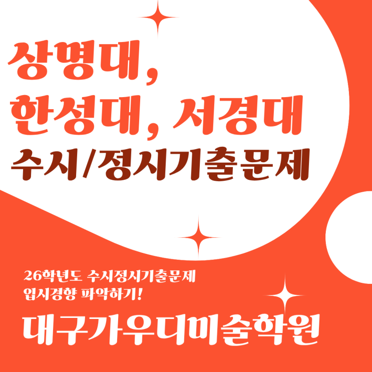 안녕하세요. 수성구시지미술학원 대구가우디미술학원에서 알려드리는 26학년도 미술대학 기출주제입니다! 오늘도 달려볼까요! 오늘 알려드릴 26학년도 미대기출주제는 상명대학교, 한성대학교, 서경대학교입니다. 모두 기초디자인 4절대학들이고 엄청난 경쟁률을 보이는 학교들이지요. 한성대부터 알아보도록 할게요! 26학년도 한성대학교 ICT디자인학부 수시기출 주제는 계산기, 클립, 담요가 출제되었습니다. 계산기는 올해 비슷한류의 제시물로 많이 출제되고 있는데요. 비슷한 류의 리모콘과 키보드 등도 함께 풀이해보면 좋을 것 같습니다. 다음으로는 서경대학교 기출주제를 알아보겠습니다. 26학년도 서경대학교 수시 기출주제입니다. VD ....... <img src="https://blogthumb.pstatic.net/MjAyNjAxMjlfMjU4/MDAxNzY5Njg5OTU5NjE0.Fxn4SMPaf-TcyXNpY8QY11AbhLm0vTsnokmTfKM4coQg.0bEgVOelgz_VuYEgeO2i3_Vrg6xlaEkjFqTYA59mmdEg.PNG/%BB%F3%B8%ED%B4%EB_%C7%D1%BC%BA%B4%EB_%BC%AD%B0%E6%B4%EB_%BA%ED%B7%CE%B1%D7.png?type=s3" />