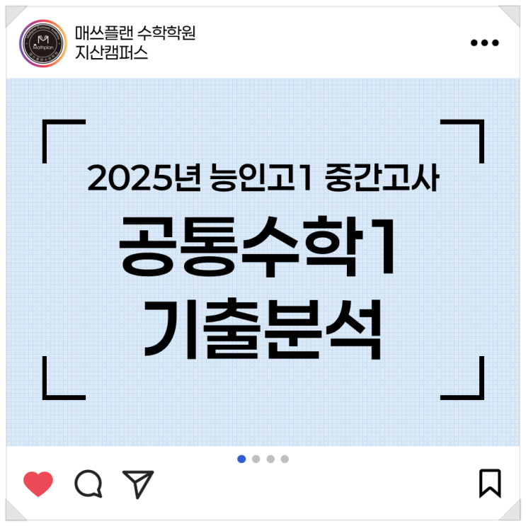 25년 대구 능인고등학교 1학년 1학기 중간 기출 분석 안녕하세요, 매쓰플랜 수학학원입니다. 2026년 새학기가 시작되었습니다! 새학기가 시작됨에 따라 첫 시험 걱정이 많을 거라고 생각합니다. 오늘은 능인고 신입생을 위해 기출 분석 후 준비 방향 알려드리겠습니다~ 문항 수에 비해 서술형의 배점이 상당히 높습니다. 그에 반해 단답형은 고난도임에도 배점이 높지 않습니다. 풀이 전략은 ① 하~중 난이도의 선택형을 빠르게 풀이한 후 ② 서술형 문제 풀이하고, ③ 남은 선택형과 단답형 마무리하는 것이 좋아보입니다. 대구 능인고등학교 시험의 자세한 사항은 아래 표 참고해주세요. 부교재 : 올림포스 유형편 (유사 문항은 중상 이상 난이....... <img src="https://blogthumb.pstatic.net/MjAyNjAyMjZfNiAg/MDAxNzcyMDQ2ODU2Mzgx.jMh2Mm2jaRNJ9zoxvW9xDb6KTywAaApgfM3oxjNjzRYg.CwaQcWWcbH8GYS-I01NtUuiIlXYsHi3jn4Zxuo7YaKAg.PNG/%C7%C1%B7%B9%C1%A8%C5%D7%C0%CC%BC%C71.png?type=s3" />