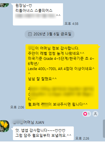 이번주는 너무나 좋은소식으로 시작했습니다 제이에스에서 영어도서관 프로그램을 꾸준히 진행한 7세 학생의 리딩 성장 결과를 소개해 드리려고 합니다. 제이에스 영어도서관 수업을 통해 영어 원서를 꾸준히 읽어온 학생이 테스트를 진행한 결과 ✔ 미국 기준 Grade 4~5 수준 ✔ 한국 기준 초등 4~6학년 수준 ✔ Lexile 400L ~ 700L 7세 학생이 이러한 수준을 보였다는 것은 단기간 문제풀이 학습이 아니라 꾸준한 영어 원서 읽기 습관과 영어 독서 환경이 만들어낸 결과라고 생각합니다. 제이에스어학원의 영어도서관 프로그램은 아이들이 영어를 단순히 공부하는 것이 아니라 ✔ 영어 원서를 자연스럽게 읽고 ✔ 내용을 이해하고 ✔ 생각....... <img src="https://blogthumb.pstatic.net/MjAyNjAzMDZfMjIw/MDAxNzcyNzk5NjQyOTgw.sKE4gZiNnA-RRhxSoFbxOw9JRAk9gECsg80Ncy0GM34g.sK_N3JQKNYacNvXPadtuAgbl8VaDFB2q1V6zst2jxMUg.PNG/%B1%E8%C1%D6%BE%C8777.png?type=s3" />