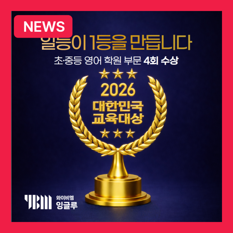 안녕하세요. 잉글루 본사입니다. YBM잉글루가 조선에듀, 조선교육 문화미디어가 주관한 2026 대한민국 교육대상에서 초·중등 영어학원 부문 4회 대상을 수상하였습니다. 다시 한번 감사드리며, 더욱 발전하는 브랜드가 될 수 있도록 최선을 다하겠습니다. 감사합니다. <img src="https://blogthumb.pstatic.net/MjAyNjAzMDNfMTg1/MDAxNzcyNTA4MjU2MzY3.22nexWymPemxnmGSruNRWDagulmjuQ01-gQtYW9BxzYg.8Jo4h60_rxkgFSl74B0VWgZCxzivD4igbhVYU0IJe18g.PNG/%BA%B9%BB%E7%BA%BB_%BD%E6%B3%D7%C0%CF_%2813%29.png?type=s3" />