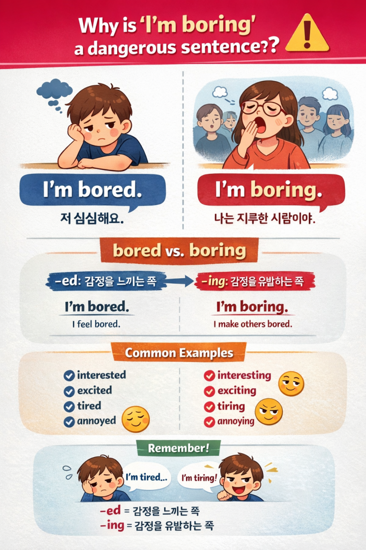 나는 심심해! I'm boring Vs I'm bored 뭐가 맞는걸까? 간헐적으로 나는 심심하다 라는 문장을 영어로 만들때 헷갈리신적 혹시 있으신가요? 그렇다면 오늘 게시물은 꽤나 많은 도움이 될거라고 자부합니다! 사실 I'm boring = 자신이 지루한 사람이라고 말하는 문장입니다. 그렇다면 I'm bored 라는 문장이 나는 심심해! 라는 문장이 되는건데요 뒤쪽에 오는 단어가 어떤식으로 큰 차이를 유발할까요? 위와 같이 ed와 ing는 형태의 차이점 뿐만 아니라 감정의 방향성의 문제로 나뉘게 됩니다. <핵심 공식> -ed => 감정을 느끼는 쪽 -ing => 감정을 일으키는 쪽 특히 위의 공식을 활용하게 되면 영....... <img src="https://blogthumb.pstatic.net/MjAyNjAzMDRfMSAg/MDAxNzcyNjI0OTkxNDg2.oIiNeZGi-NFtzQrs6dHoWibP-IAnXS9W1Fn5qCR7b8kg.yMw3L55_MhmIZQ7_i8aQuiPnceLllJDgmoFzbFIOyKkg.PNG/e639e824-555d-462e-8268-d5866ace0211.png?type=s3" />