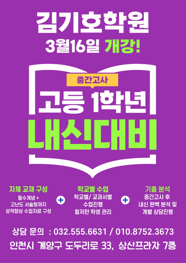 안녕하세요 계양구 NO.1 단과 입시전문 수학 영어 과학 국어 김기호 학원입니다. 살랑이는 봄바람과 함께 고1 학생들의 고등학교 첫 내신 시험도 한 걸음씩 다가오고 있습니다~ 설렘으로 시작한 고등학교 생활, 하지만 첫 시험을 앞두고는 누구나 조금은 긴장되기 마련이죠. 그래서 저희 김기호 학원은 3월 16일부터 고1 수학 시험 대비를 시작합니다~ 고1 첫 시험이 중요한 이유~ ✔ 앞으로의 내신 흐름을 결정하는 첫 시험 → 고1 첫 시험은 이후 내신 관리의 기준점이 됩니다. 첫 시험에서 자신의 학습 수준과 학교 시험 유형을 정확히 파악하면 이후 시험 대비 전략을 세우기가 훨씬 수월합니다. 반대로 첫 시험에서 준비 방법을 놓치면....... <img src="https://blogthumb.pstatic.net/MjAyNjAzMDRfMjE3/MDAxNzcyNjIyNzE3MDg5.ti3xwQvVXykoNYR74oaF15gejDmAp3WfXdGYA86r728g.FbRap5d9l670Qe5ZBrnG15SrhFQZFosxYB9D22-SZi0g.JPEG/%B3%BB%BD%C5-%C6%F7%BD%BA%C5%CD-001_%285%29.jpg?type=s3" />