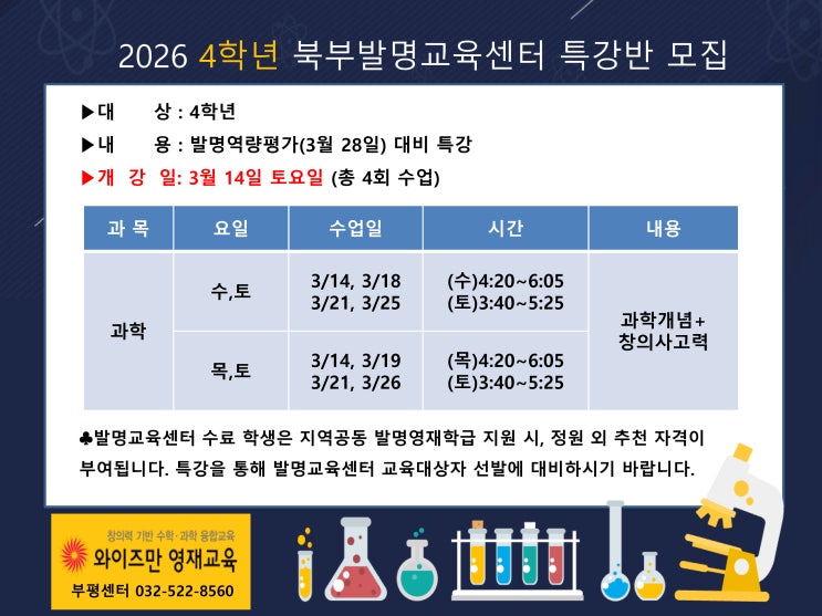 안녕하세요~와이즈만 부평센터입니다.^^ 발명교육센터 교육대상자 선발 대비 특강 안내입니다. 4학년부터 영재원 준비가 시작되죠. 학교 단위영재학급과 교육청 발명교육센터가 그 시작인데요. 물론 저학년들을 대상으로 하는 영재원도 있지만 학교에서 시작되는 수업은 4학년부터입니다. 발명교육센터는 발명교육 확대를 통해 창의적 사고 능력과 과학적 소양을 갖춘 창의융합형 인재 양성을 목표로 하고 있습니다. ◈선발 방법은 1차 선발: 학교장 추천 학교별로 4학년 전체 인원에 따라 달라지며 약 7~10% 정도 추천 인원이 정해집니다. 추천인원 초과 시 학교 내 선발고사가 진행되며 추천자는 별도 안내됩니다. 2차 선발: 3월 28일 (토) 학....... <img src="https://blogthumb.pstatic.net/MjAyNjAzMDZfNDAg/MDAxNzcyNzg3ODI0MjM4.SKWjuzbOcTNpw6TTUOe3Zleae90Y5-Q_HTsrEHlNmucg.Cx44qnpRFRIFpEQCr3MXNEVoBtyPxKUfSEvlhd-ZtQYg.JPEG/26_%B9%DF%B8%ED%B1%B3%C0%B0%BC%BE%C5%CD_%C6%AF%B0%AD_%BE%C8%B3%BB%B9%AEpdf_3.jpg?type=s3" />