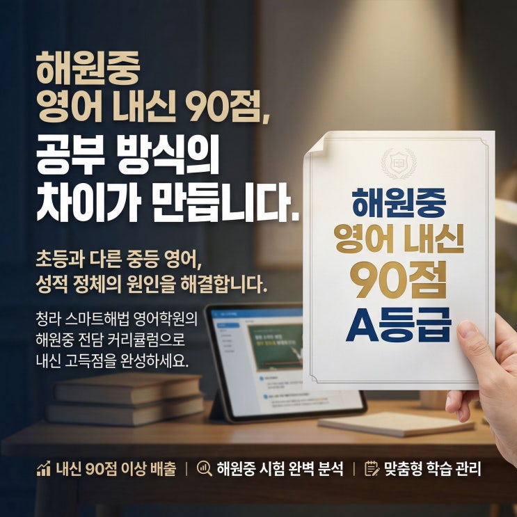 청라 스마트해법 영어학원에서 알려드립니다. 해원중 영어 내신을 준비하는 학부모님들과 상담을 하다 보면 가장 많이 듣는 질문이 있습니다. “우리 아이 영어 공부를 하는데 점수가 왜 잘 안 나올까요?” “해원중 영어 시험은 어떻게 준비해야 하나요?” 초등학교 때 영어를 잘하던 학생들도 중학교에 올라가면 성적이 흔들리는 경우가 많습니다. 특히 중학교 영어 시험은 초등 영어와 공부 방식이 많이 달라지기 때문에 공부 방법을 바꾸지 않으면 성적이 정체되기 쉽습니다. 오늘은 청라 5단지 중등 영어학원에서 해원중 영어 내신 90점 이상 받는 공부 방법을 정리해 보겠습니다. 해원중 영어 내신 시험의 핵심 중학교 영어 시험은 크게 세....... <img src="https://blogthumb.pstatic.net/MjAyNjAzMDlfMTI3/MDAxNzcyOTgyMTk4ODIy.p0eADFqvGUY2rH_rBhhIbOsfQ3GGqF_unHTiXgeKV2Eg.UKSFAPno-oH_EIXenpWSbLbyqPOQdHoexFN1PojIIbIg.JPEG/AIDrawing_260309_e7bf7e39-500f-4865-90af-10443a3f8c25_0_MiriCanvas.jpg?type=s3" />