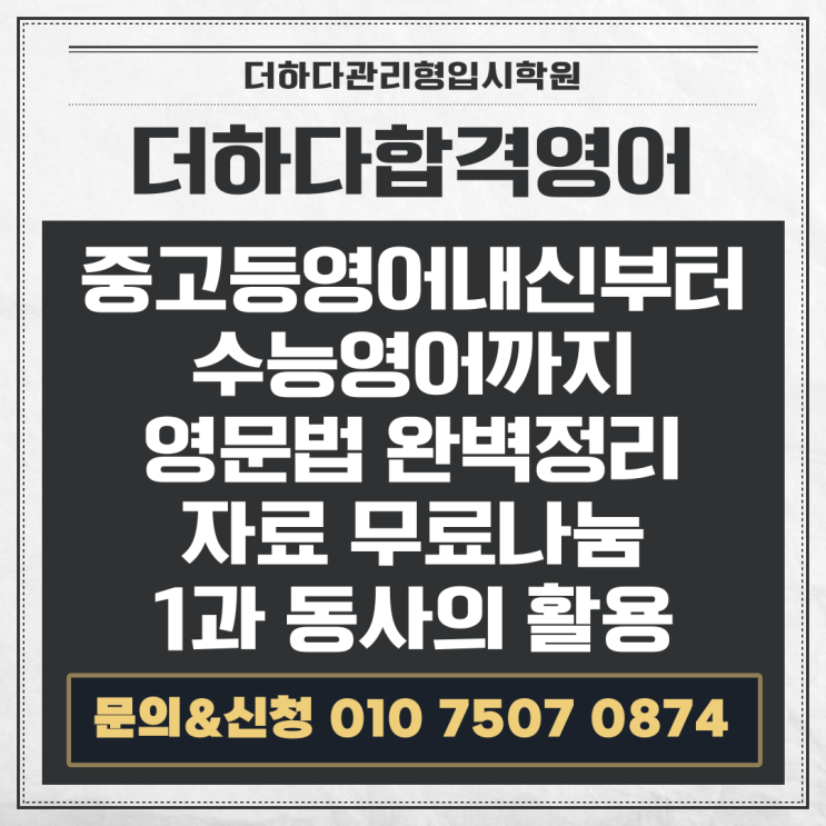 안녕하세요~ 대전둔산동, 더하다관리형입시학원 영어원장 "합격영어" 안쌤입니다~ 중고등 내신영어부터 수능영어까지, 우리 학생들을 가장 괴롭히는 영어의 산맥이 바로 '문법'이죠? 그중에서도 영어 문장의 뼈대를 결정하는 '동사의 활용(문장의 1~5형식)'은 영어 실력의 기초를 다지는 데 가장 중요한 핵심입니다. 우리 중학교, 고등학교 학생들, 그리고 다시 한번 도약을 준비하는 N수생 여러분이 영어 문법을 조금 더 쉽고 명확하게 이해할 수 있도록 제가 직접 연구하고 제작한 [영문법 이론 1과: 동사의 활용] PDF 자료를 무료로 배포합니다! [무료배포] 영문법의 뼈대를 잡다! 안쌤의 '동사....... <img src="https://blogthumb.pstatic.net/MjAyNjAzMThfMTAw/MDAxNzczODA4MTM4Njgx.bPsin1zWi140ppiUcTUEVUNV7tNpuEvkbunRLQDM-RAg.t1Z3v30KoJufKotHqNHNCksqKIbOXwez8-LPkgK7EPAg.PNG/%BC%F6%C7%D0%B0%FC%B7%C3%BA%ED%B7%CE%B1%D7%C7%A5%C1%F6%C1%F6-002_%2818%29.png?type=s3" />