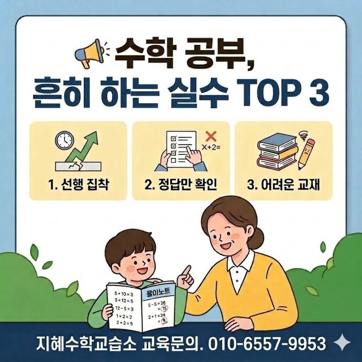 안녕하세요! 아이들의 수학적 지혜를 쑥쑥 키워주는 지혜수학교습소입니다. 저는 '선생님, 저 이거 혼자 풀었어요!'라고 외치며 환하게 웃는 아이들을 볼 때 가장 행복합니다. 하지만 처음 온 아이들 중에는 정답만 맞히고 '왜?'라는 질문에는 고개를 갸우뚱하는 경우가 많아 안타깝기도 합니다. 수학 공부를 할 때 흔히 하는 대표적인 실수들, 혹시 우리 아이의 이야기는 아닐까요? 1. 선행이 빠르면 잘하는 것 아닌가요? 2. 무조건 많이 풀고 정답만 찾기 3. 수준보다 어려운 심화 교재 선택 첫째는 우리 아이의 현재 실력을 고려하지 않은 채 진도만 앞서가는 것입니다. 수학은 ‘얼마나 빨리’보다 ‘얼마나 정확히....... <img src="https://blogthumb.pstatic.net/MjAyNjAzMThfMTY4/MDAxNzczODIzMTA3Mzc0.QMv9dO5NxqAY9ARwrHjzy-XVC5rzoNX2IbEBmaZ1Tkog.a4GTHOI1yBDRkVTenzh8kST5KcJycksuebGUa4943Bgg.JPEG/unnamed.jpg?type=s3" />