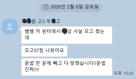 모의고사 97점 나왔어요! 수업 마무리할 때쯤, 고3 학생에게서 카카오톡 메시지가 도착했습니다. 문법 한 문제를 제외하고 전부 정답이라는 내용이었습니다. 숫자만 놓고 봐도 충분히 기쁜 결과였습니다. 그런데 저는 점수보다 먼저 다른 생각이 들었습니다. ‘아, 이제 어디를 가도 괜찮구나.’ 함께한 반은 고2 기말 내신까지 마치고 11월 말에 수업을 마무리했습니다. 3학년 내신 영어를 선택하지 않는 친구들이 있어서 최소 학생 수 부족으로 자연스럽게 정리가 된 상황이었습니다. 그래서 더 마음이 쓰였습니다. 반이 없어져서 끝나는 수업이 아니라, 정말 실력이 완성된 상태에서 마무리되어야 한다고 생각했습니다. 고2 내신 9등급제에서....... <img src="https://blogthumb.pstatic.net/MjAyNjAzMDNfMjEg/MDAxNzcyNTQzMjQzOTM5.T9mSFSJJPAEpEgiwS9oB1wqkNEnpgyugKmOa-dzBTHog.OryNG6c6jjFY3aIMhj5sjlLYiSMo6uzEWulr00nzmqkg.PNG/image.png?type=s3" />