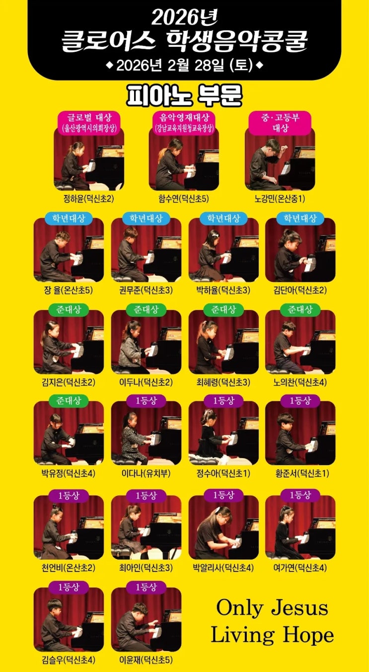 2026년 클로어스 학생음악 콩쿠르 피아노 부문 결과 글로벌 대상(울산광역시의회장상) 2학년 정하윤 음악영재대상(강남교육지원청교육장상) 5학년 함수연 중ㆍ고등부 대상 중1학년 노강민 학년대상 5학년 장 율 3학년 권무준, 박하율 2학년 김단아 준대상 2학년 김지은, 이두나 3학년 최혜령 4학년 노의찬, 박유정 1등상 유치부 이다나 1학년 정수아, 황준서 2학년 천언비 3학년 최아인 4학년 박알리사, 여가연, 김슬우 5학년 이윤재 *성악부문 결과 클로어스 대상(국회의원상) 5학년 이윤재 학년대상 4학년 노의찬 준대상 2학년 이두나 5학년 함수연 1등 유치부 이다나 2학년 김단아 2학년 천은비 정말 수고많았어요~♡ #덕신미소음악학원 #덕신....... <img src="https://blogthumb.pstatic.net/MjAyNjAzMDhfMjcz/MDAxNzcyOTYzNjQzNzUy.Myb956QCpj3eTaJ88IMTOZRqoJ9S8BlDmToGz_90-Mog.GD2HVKpIQhoGSFETvuCcFvnUQtfTQUPIw9VC6HK31gwg.JPEG/900%A3%DF1772593608476.jpg?type=s3" />