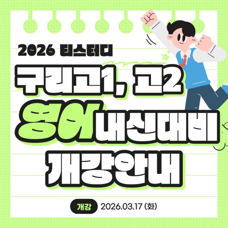 3월 17일 화요일 구리고1, 구리고2 영어 내신대비 개강! 구리고1, 구리고2 만을 위한 구리고 영어 전문 강사 직강 수업 화, 목 오후 6시 – 10시 안녕하세요 티스터디입니다. 티스터디에서 구리고1, 구리고2 학생들만을 위한 영어 내신대비 수업을 개강합니다. 구리고, 구리여고, 토평고, 수택고 전문학원 대입전문 단과학원 티스터디 자세한 문의는 학원으로 연락 부탁드립니다. 031. 551. 3331 제 2536-4호 영어 수강료 40만원 <img src="https://blogthumb.pstatic.net/MjAyNjAzMTBfODMg/MDAxNzczMTQyMzE0MDI0.Zo4B9lEdFzohTExIQjXiUTCZOYA-rUeX93dNc4JQuIcg.2ZRLHOaORO4ZS5Gl43LnH5XhX6hP3u2YvTFZIxO5YgUg.JPEG/%C1%A6%B8%F1%C0%BB_%C0%D4%B7%C2%C7%D8%C1%D6%BC%BC%BF%E4._%281%29.jpg?type=s3" />