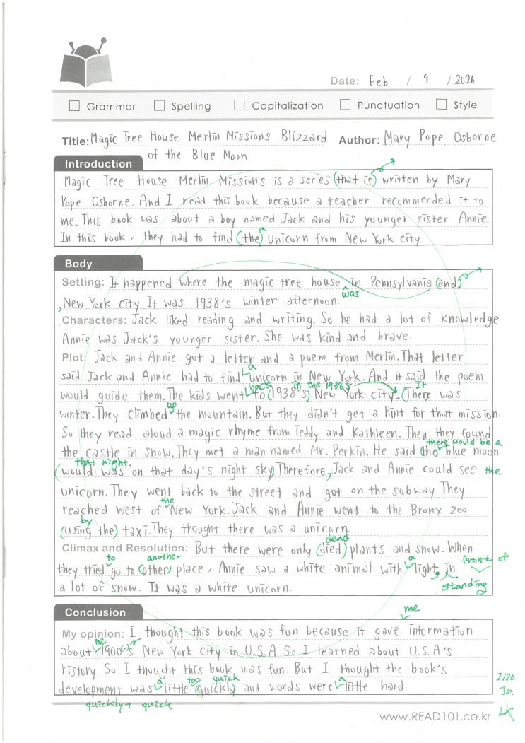 안녕하세요, 리드101 수지 신봉점입니다. 홍천중1 A**학생의 <Magic Tree House Merlin Missions Blizzard of the Blue Moon> writing 입니다. https://www.instagram.com/read101_sinbong/ #리드101수지신봉 #리드101신봉 #신봉영어도서관 #신봉영어학원 #수지영어도서관 #수지영어학원 #수지 #신봉 #리드101 #writing #수지영어도서관 #영어리딩 #원서읽기 #영어원서 #영어책읽기 #신봉초영어 #신봉초 #성서초 #성복초 #효자초 #신일초 #홍천초 #신리초 #수지초 #영어라이팅 #READ101 <img src="https://blogthumb.pstatic.net/MjAyNjAzMTFfNSAg/MDAxNzczMjA3Mzc3MzQ2.ms0o2tnfR5BROg50vpjsTEdeWZzk3ptSvZriW7bhfKgg.NIpNmhrK-mUJOPTxhEebN6Nhev1zg5AzqTM7dzW2eCgg.JPEG/%B1%E8%C7%CF%C0%BDAmy_Magic_Tree_House_Merlin_Missions_Blizzard_of_the_Blue_Moon_26.03.11.jpg?type=s3" />