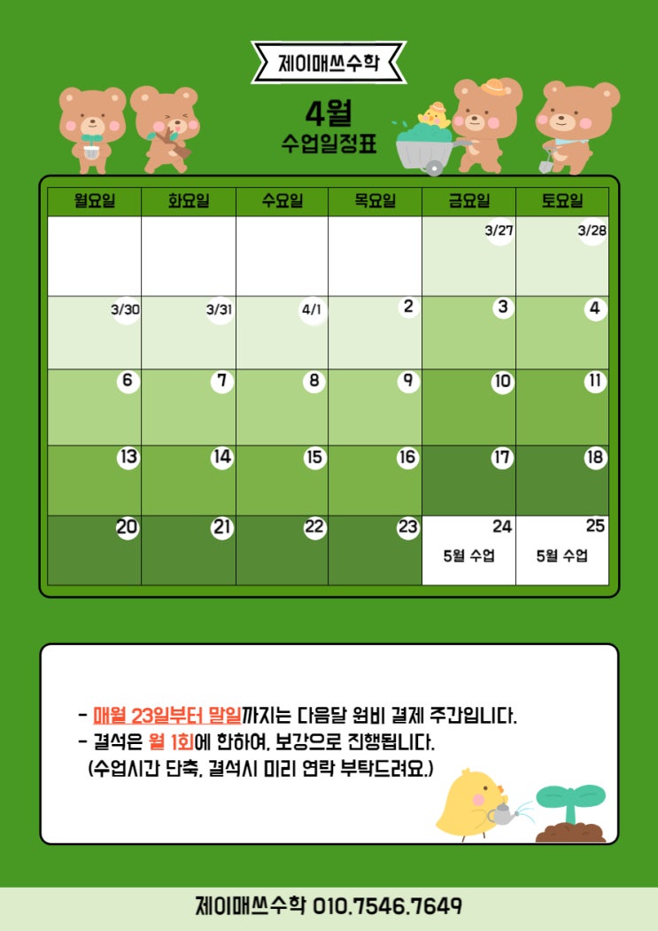 안녕하세요~ 제이쌤입니다. 4월 수업일정표 올려드립니다. 감사합니다. <img src="https://blogthumb.pstatic.net/MjAyNjAzMjNfMjEg/MDAxNzc0MjQwNDAyNTIy.RPuVcTnFNz_rDc-rXeWZZhtv-LPNt9Thkfnbq8mA2wsg.7ueb5wl9ZHI3SFnH6zLw1IZUlhqNHk8XZgGJL8aNvqAg.JPEG/%C1%A6%B8%F1%C0%BB_%C0%D4%B7%C2%C7%D8%C1%D6%BC%BC%BF%E4__%BA%B9%BB%E7%BA%BB_%285%29-001.jpg?type=s3" />
