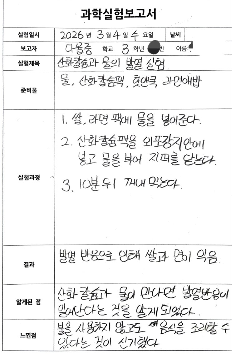 안녕하세요! [온리원아카데미학원]입니다. 오늘은 중3 과학 '화학 반응과 에너지' 단원을 눈과 입으로 완벽 이해하는 산화 칼슘 발열 실험을 진행했습니다! 실험 미션: 불 없이 전투식량 익히기! 군대 전투식량이나 발열 도시락은 불이 없어도 뜨겁게 익죠? 그 비밀은 바로 **산화 칼슘(CaO)**에 있습니다. 실험 과정 쌀과 라면이 든 팩에 물을 붓습니다. 외포장지에 **산화 칼슘(발열팩)**을 넣고 물을 붓습니다. 지퍼를 닫고 10분만 기다리면 끝! ⚗️ 과학 원리 쏙쏙! 산화 칼슘이 물과 만나면 수산화 칼슘으로 변하며 엄청난 에너지를 뿜어내는데, 이를 **'발열 반응'**이라고 합니다. 이 열이 100°C 가....... <img src="https://blogthumb.pstatic.net/MjAyNjAzMDZfMTYy/MDAxNzcyNzc5OTYxNjAx.AX2NRKr49skBfaJqSc4haUmwl8rOOM4SlaX4iaRhPxwg.C6MJ6fW43XwO-Yo78K4tTfQLdzx-iEB00zGa1Krqjacg.JPEG/900%A3%DF20260304%A3%DF215627174_%A3%A81%A3%A9.jpg?type=s3" />