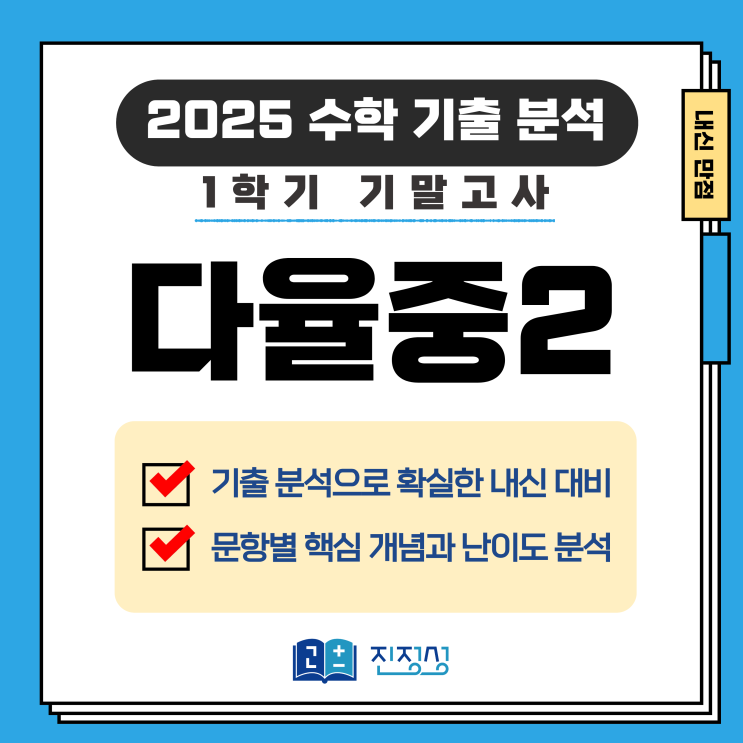 안녕하세요! 진정성 국어 • 수학 전문학원입니다. ☺️ 내신 만점을 위한 기출 시험지 심층분석 포스트 입니다! 오늘 분석해볼 시험지는 [다율중 2학년 1학기 수학 기말고사] 입니다. 그럼 자세한 분석을 시작하기 전! 시험 기본 정보부터 설명드리겠습니다~ 시험 기본 정보 다율중학교 2학년 1학기 수학 기말고사는 연립일차방정식의 계산부터 일차함수의 도형적 응용까지 폭넓게 출제되었습니다. 단순 연산 문제보다는 조건을 만족하는 미지수 구하기와 실생활 및 도형 활용 문제의 비중이 높아 변별력을 확보했습니다. 특히 일차함수 단원에서는 그래프의 성질을 정확히 이해하고 식을 세울 수 있어야 풀 수 있는 문제들이 다수 포함되어 체....... <img src="https://blogthumb.pstatic.net/MjAyNjAzMDZfMjI2/MDAxNzcyNzc4MjI1NzAz.-xqCErBGaabzSNks17qAyhvoa1x0ocKeUT1fcWSRhKwg.RX-bE-eSD4DZZnQEz2ofL_w0IDd2DygwWv53V2y90x4g.PNG/2025_%B1%E2%C3%E2_%C7%D0%B1%B3%BA%B0_%BA%D0%BC%AE_%BC%B6%B3%D7%C0%CF_%284%29.png?type=s3" />