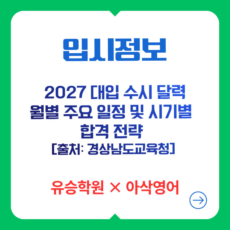 안녕하세요. 원주 단구동에서 20년, 실력으로 결과의 차이를 만드는 유승학원입니다. 현재 고등학교 2학년 학생들이 치를 2027학년도 입시는 보이지 않는 전쟁과 같습니다. 승리하기 위해서는 전체적인 흐름을 파악하고 제때 필요한 준비를 마쳐야 합니다. 경남대입정보센터의 '2027 대입 수시 달력'을 바탕으로 반드시 체크해야 할 월별 로드맵을 정리해 드립니다. ▶ 1. 상반기: 기초 다지기와 목표 설정 (3월~6월) 3월~4월: 첫 학력평가 성적을 바탕으로 자신의 위치를 객관적으로 파악하고, 희망 대학의 전형 요강을 탐색해야 합니다. 6월: 수능 모의평가는 수시 지원의 하한선을 결정하는 중요한 지표입니다. 내신과 수능 공부의....... <img src="https://blogthumb.pstatic.net/MjAyNjAzMjBfMTU5/MDAxNzc0MDEzNTQyOTcx.EwVTGY4oxXOSChAXLycGnlTqVGVEExdX8mxexmGsTi8g.UhIJn_p8ScStM47iS8P_NDEv7r6RUyns-B2NnPOcjUAg.PNG/%C6%C4%B6%F5%BB%F6%B0%FA_%B0%CB%C1%A4%BB%F6_%BD%C9%C7%C3%C7%D1_%BE%C6%C0%CC%C4%DC_%C0%FC%B9%AE%C0%FB%C0%CE_%B0%E6%C1%A6_%B1%DD%C0%B6_%BF%EB%BE%EE_%BB%E7%C0%FC_%C1%A4%BA%B8_%BE%C8%B3%BB_%C0%CE%BD%BA%C5%B8%B1%D7%B7%A5_%C4%AB%B5%E5%B4%BA%BD%BA_%284%29.png?type=s3" />