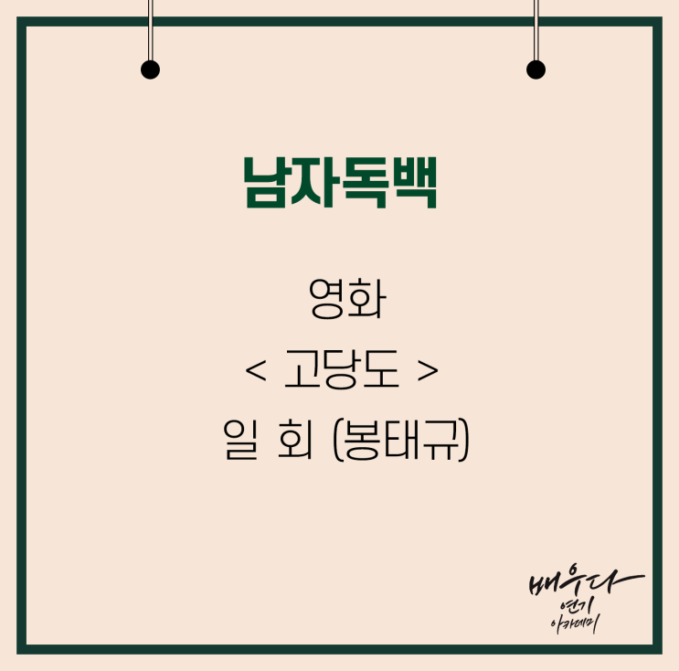 영화 < 고당도 > 일회 (봉태규) 남자독백 일회 : 누나 이왕 이렇게 된 거 우리 아버지 장례 지금 하자. 선영 : 하, 너 지금 제정신 아니야. 일회 : 아니, 누나, 어차피 아버지 금방 돌아가실 거라며, 어? 이번에 딱 한 번만 장례 빨리하자. 선영 : 그러면 장례를 딱 한 번만 하지 두 번 하는 사람도 있냐? 말 같지도 않은 소리 하고 있어, 씨. 일회 : 내가! 선영 : 놔! 일회 : 내가 모레까지 돈을 못 갚잖아? 그러면 진짜 죽을 수도 있어. 나 그냥 죽어? 그래, 나는 그냥 죽어도 돼. 근데 동호는? 걔는 어떡해? 선영 : 너 지금 나 협박하냐? 일회 : 대학 보내야 될 거 아니야? 선영 : 뭔 소리야? 동호가 대학을 왜 못 가? 아까 다 해결했잖....... <img src="https://blogthumb.pstatic.net/MjAyNjAzMTJfMzIg/MDAxNzczMzA3OTc5NzEz.jRjnkAuo9bawKYU9j4tdStxMDrHDXGyLHzX88tmNg-Mg.ufi_pHp5NnTi7Pi3cZBggCRZdEDOgUom9cS_TsXpEiUg.PNG/%B0%ED1.png?type=s3" />