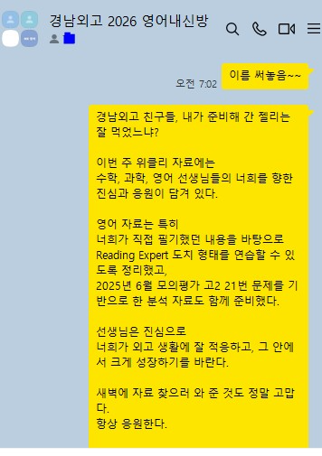 안녕하세요? MK아카데미 반송캠퍼스 학원 센터장 장재훈입니다. 경남외고에서 위클리 MK를 처음 진행한 날이었습니다. MK는 학기초 학생들의 학교적응과 학교수업에 맞는 맞춤형 교육을 준비하면서 어떤게 하면 우리의 진심을 학생들에게 보여줄 수 있을지 정말로 고민하였습니다. 새벽 등교 시간, 학교로 향하는 우리 학생들의 얼굴이 평소보다 밝고 상기되어 있었습니다. 시간이 짧아서 간단하게 간식만 나눠주고 자료주고 어깨 한번 툭툭 두드려주고 왔지만 너무 의미있는 시간이었습니다. 아이들이 그 이후 개인적으로 보내준 카톡에는 “어제 그 Reading Expert 도치 부분 학교에서 내준거랑 똑같은 형태라서 좋았어요.” “정말 열심히 하....... <img src="https://blogthumb.pstatic.net/MjAyNjAzMTRfMjc4/MDAxNzczNDY1Nzc0NTgy.yt5hlqoB8G1SjYwEzUmLYJ8_eNAoXBAQKvYsiVzy_m0g.5Fw5k1m9a-kKCO8pJ63JfG907mPugvnZKR6Z3EW5UB0g.PNG/image.png?type=s3" />