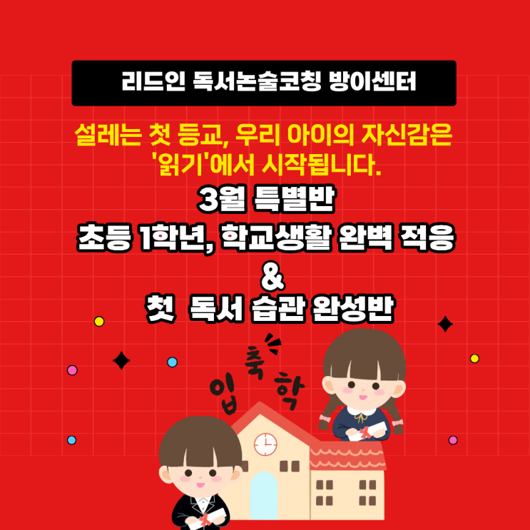 안녕하세요! 우리 아이들의 바른 독서 습관을 책임지는 리드인 독서논술코칭 방이센터입니다. 겨울이 갑자기 자취를 감추고 따뜻한 봄바람과 함께 우리 아이들의 가슴 설레는 초등학교 입학이 다가왔습니다. 학부모님들, 아이의 첫 등교를 앞두고 기대감만큼이나 "우리 아이가 40분 수업에 잘 집중할 수 있을까?" "학교 공부는 잘 따라갈 수 있을까?" 하는 걱정도 크시지요? 설레는 첫 등교, 우리 아이의 자신감은 바로 '읽기'에서 시작됩니다. 리드인 방이센터가 1학년 친구들의 완벽한 학교생활 적응을 위해 1학년 첫 독서 습관 완성반 을 준비했습니다. 장문의 독서가 지구력을 만듭니다! 리드인 방이센터만의....... <img src="https://blogthumb.pstatic.net/MjAyNjAzMDNfNCAg/MDAxNzcyNDg1NDE4MjAw.UYPD04CmYB-9LaksuSnDCnnWLSlh_2BJ-FrVZ1zqSsQg.juuyLe5UVzIEoWejTSqhakgsRcMWL5SDSPvzb9ImG8og.PNG/1.png?type=s3" />