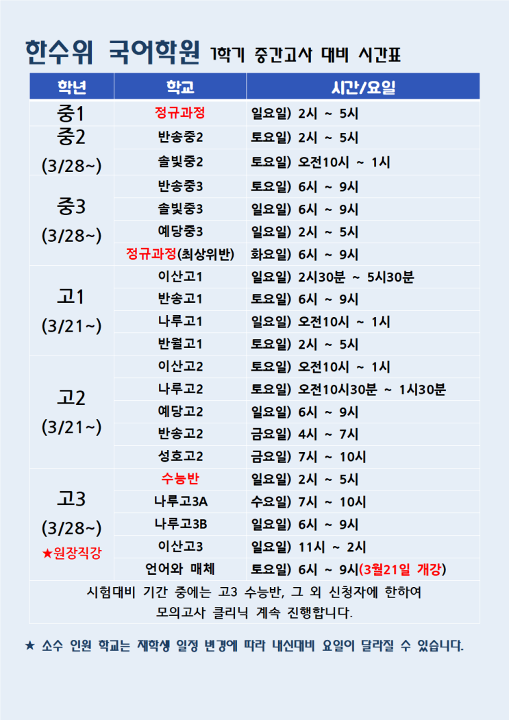 3월21일 토요일 개강 : 고등(1,2), 고3언어와 매체 3월28일 토요일 개강 : 중등(2,3), 고3 <img src="https://blogthumb.pstatic.net/MjAyNjAzMTJfMjAx/MDAxNzczMzE5NTM2OTc5.7Ktdp-RP8TrG0zmu2ZJyjsisPAV4KAthABq7yXdeducg.laCrKpBCzkT7ZdbfpAVEVYvUvUUNCx4iXKQpR-E6Mh4g.PNG/%C1%DF%B0%A3001.png?type=s3" />